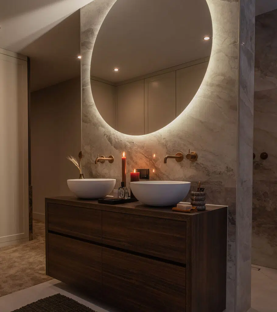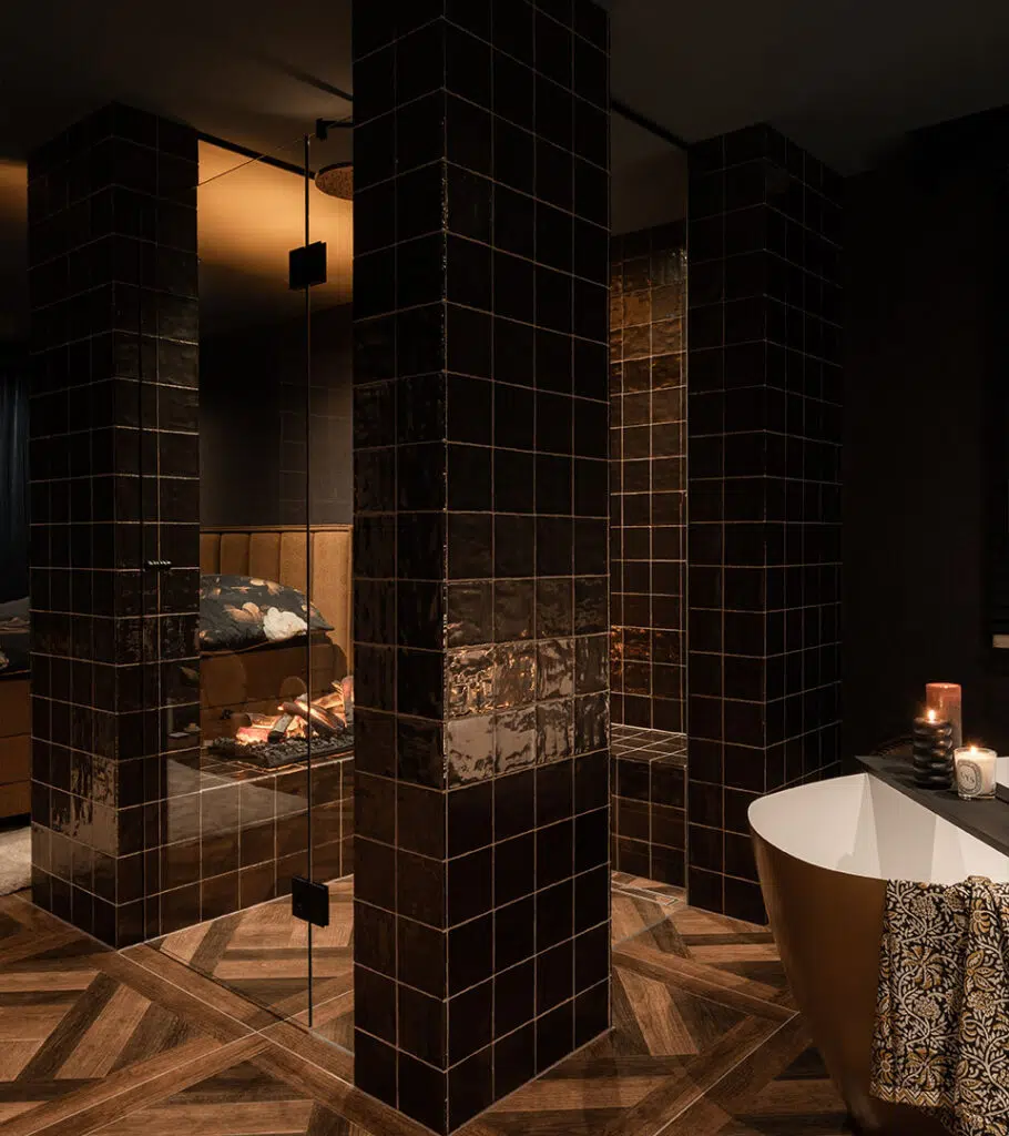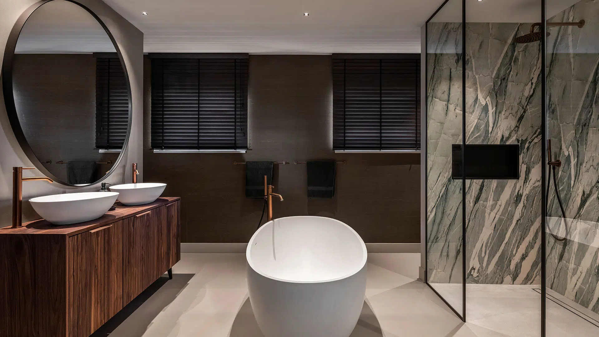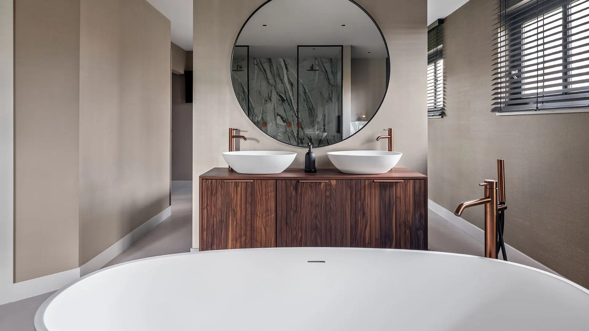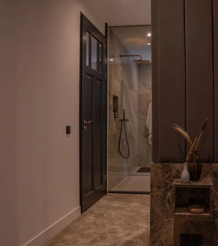 “Dat is zeker mogelijk. Door slim om te gaan met de indeling van de ruimte, kun je waanzinnig mooie badkamers en-suite creëren. Niet alleen de grote details zijn van belang. Ook de verlichting in de ruimte heeft invloed op de samenhang. Prachtige wandarmaturen bij het badkamermeubel, of een riante kroonluchter boven een vrijstaand bad, dragen bij aan het ultieme badkamer en-suite gevoel.”