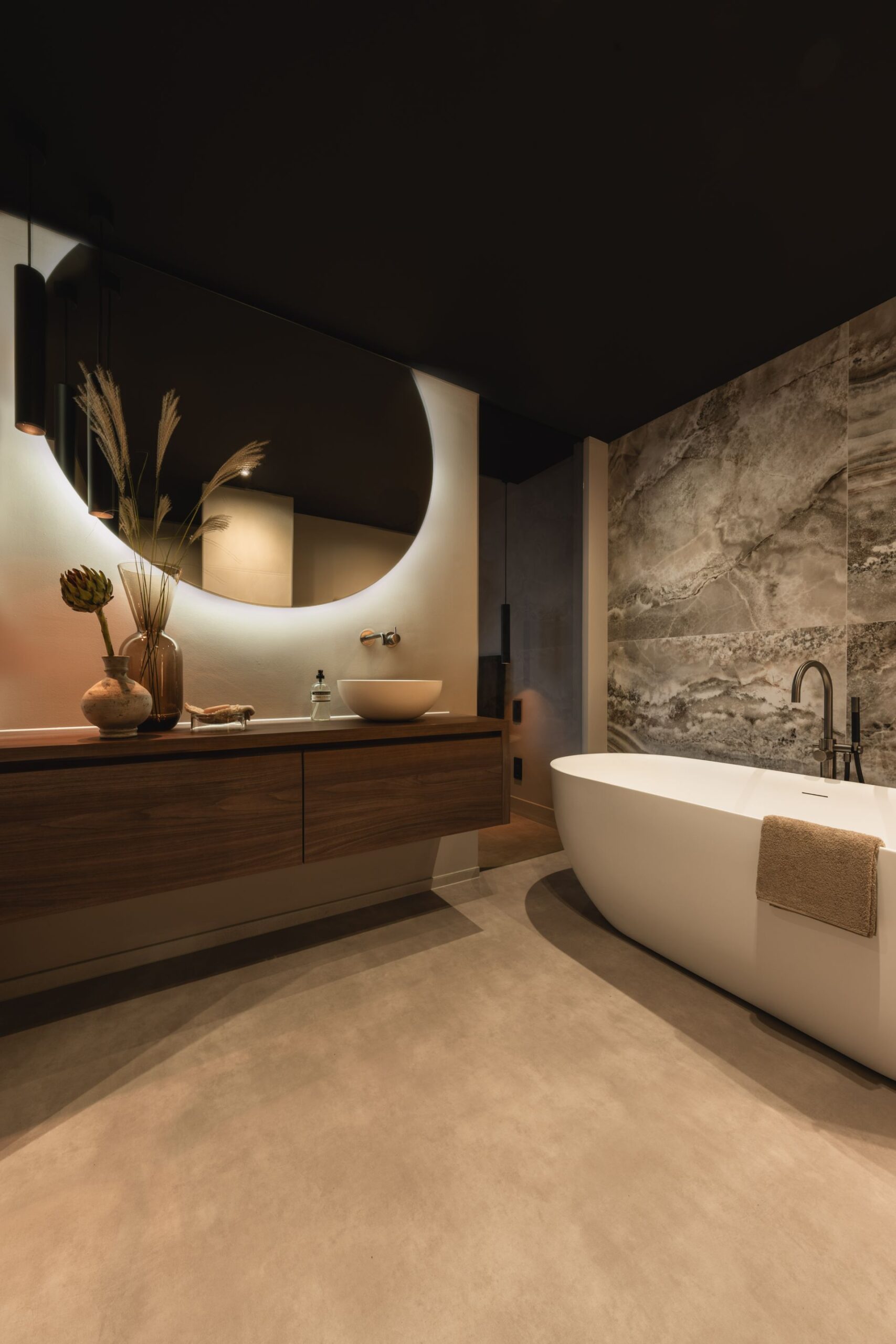In de en-suite badkamer is gekozen voor verschillende bruin en beige tinten. De beige tegels in de badkamer zijn fenomenaal. Het vrijstaande bad heeft een prominente plek gekregen en is zichtbaar vanuit de slaapkamer. Achter het ligbad zijn prachtige marmeren platen gebruikt. Deze zeer grote marmeren tegels dragen bij aan een ultiem gevoel van luxe. Deze prachtige badkamer in Amsterdam bewijst dat een luxe badkamer niet groot hoeft te zijn. Juist de indeling en het materiaalgebruik zorgen voor een ultieme, luxe uitstraling.