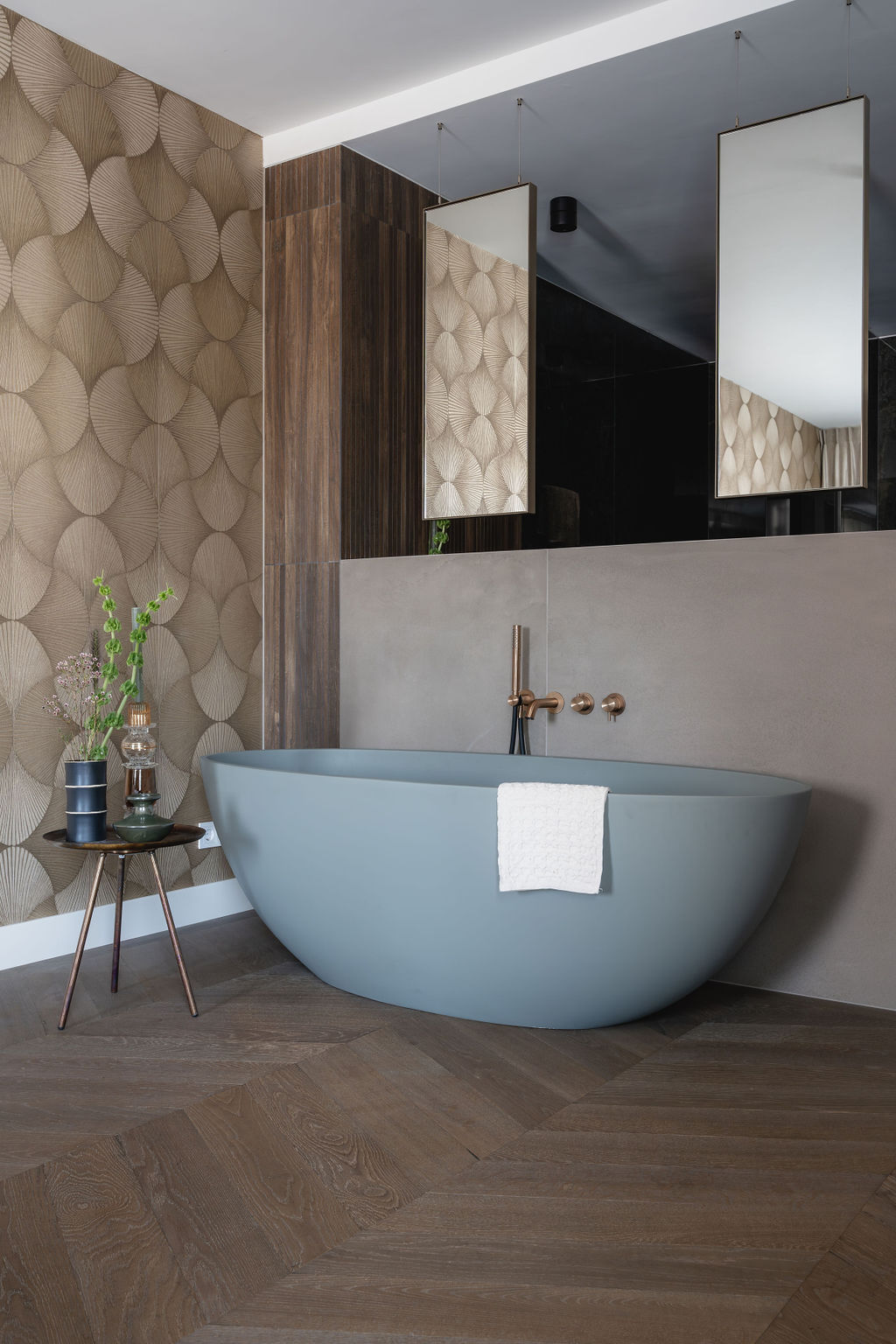 “Eerst zat er een dichte badkamer aan de slaapkamer. We hebben de ruimte er helemaal uitgehaald en opnieuw opgebouwd. We vinden het heel fijn dat de badkamer open is, dus in verbinding met de slaapkamer. En dat het heel sfeervol is. Hele warme en hele chique elementen, zoals de Gessi kranen, de Sunshower en de heerlijkste douche die we ooit hebben gehad. We zijn echt heel content met onze tegelzetter Mark, van Tegel Compleet uit Arnhem. De man die het glas kwam inmeten had het nog nooit zo meegemaakt, dat het zo perfect klopt.”