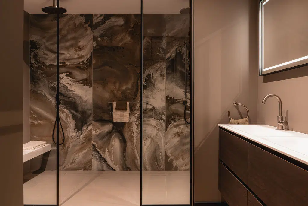 Deze stijlvolle design badkamer ademt sfeer en luxe. De familie Hegeman durfde voor kleur op de muur de gaan. De zacht vergrijsde groentint van de marmerlook wandtegels creëren een rustige, warme sfeer, terwijl ze ook een groots gebaar op de wand maken. Het geheel oogt daardoor veel zachter.