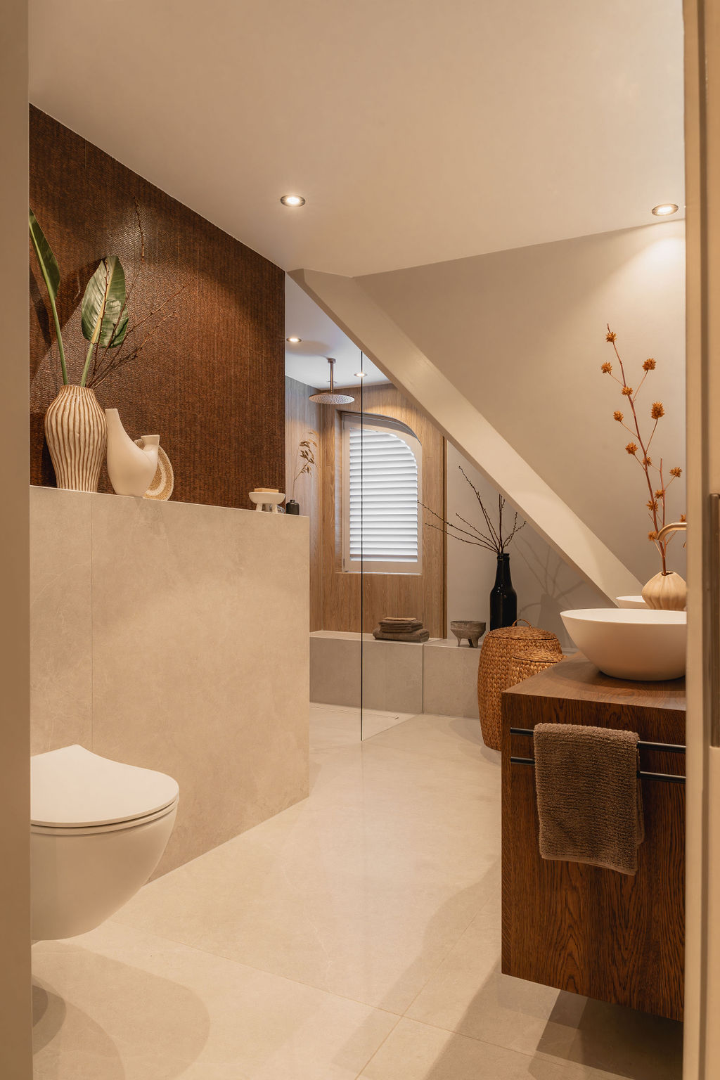 In deze Japandi badkamer van Henny en Eduard komt alles op een natuurlijke manier samen. De schuine wand en andere uitdagende hoeken in de badkamer zorgen voor een bijzondere indeling, ingericht met uniek maatwerk. Zo loopt de verdiepte lambrisering achter het toilet door over de gehele wand, gaat de hoek om en loopt door tot in de doucheruimte.