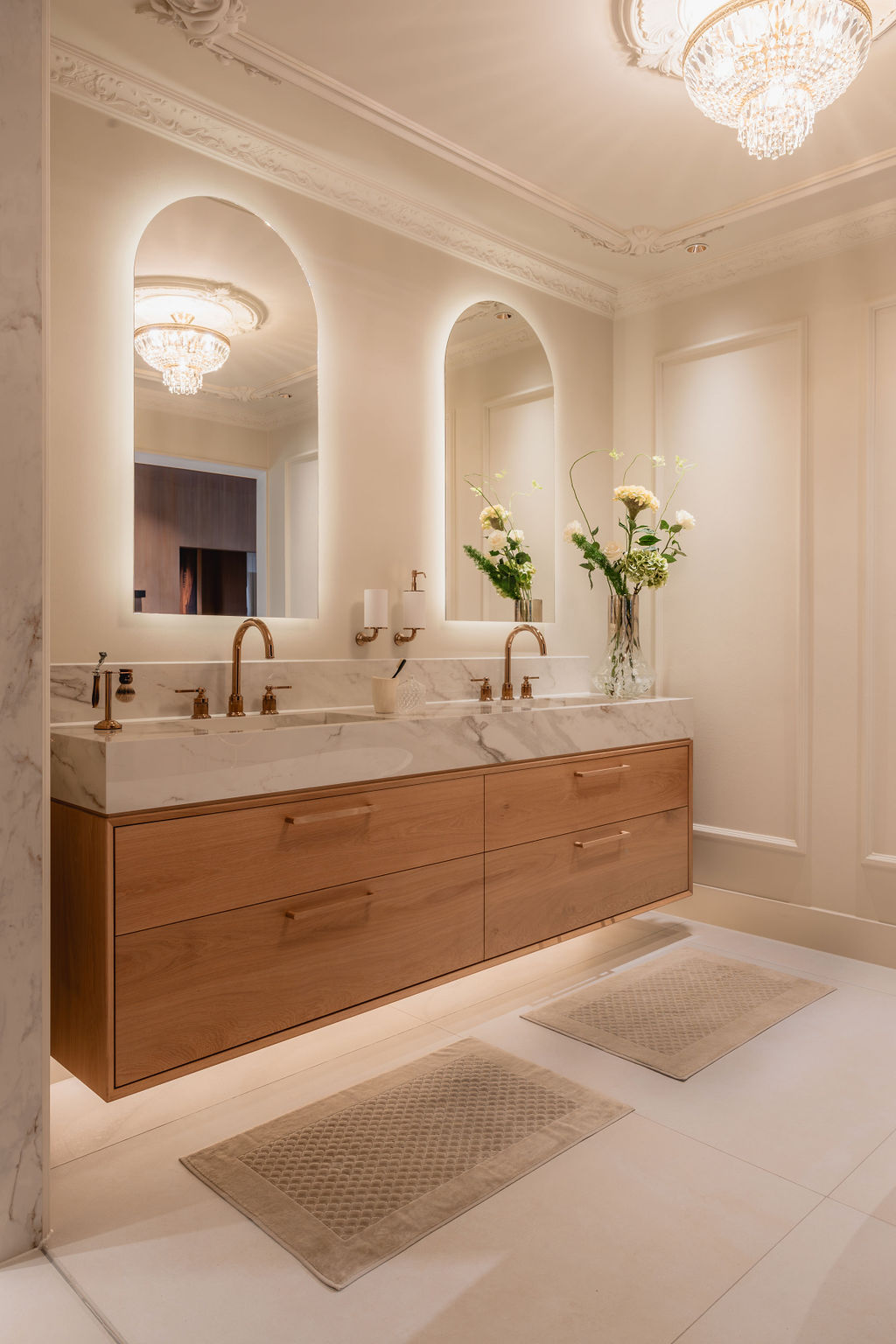 “Het geheel maakt de badkamer echt bijzonder, dat het helemaal klopt. Ik vind dat altijd met onze badkamers: het hoeft niet helemaal je smaak te zijn, maar hij moet wel helemaal kloppen. In deze badkamer zie je dat in de randafwerking, de kroonluchter en de Venti kranen van Gessi. Dat geheel maakt het echt een mooie combinatie.”