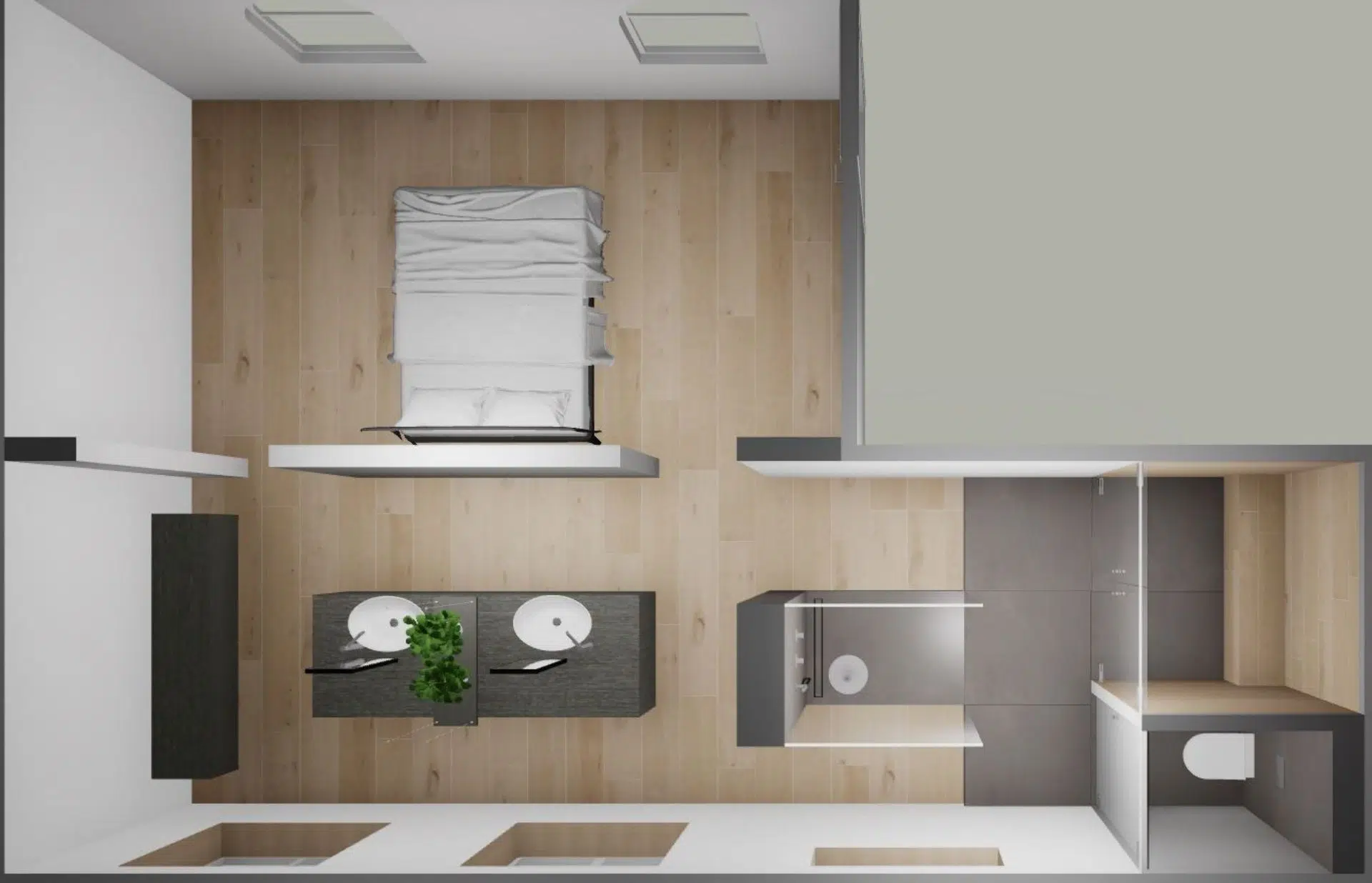 “De uitdaging zat hem vooral in het wellnessgedeelte van de badkamer ensuite. Ik dacht goed na over hoe ik het droge en natte gedeelte goed in elkaar kon laten overlopen, zonder dat het afbreuk doet aan de eenheid en schoonheid van de ruimte. Om die reden heb ik de tekening aangepast, met de opening van de douche tegenover de opening van de sauna en het toilet. De saunadeuren hebben wij ook geleverd en die zijn echt uniek. Het douchegedeelte is volledig gemaakt van helder glas en reikt tot het plafond.”