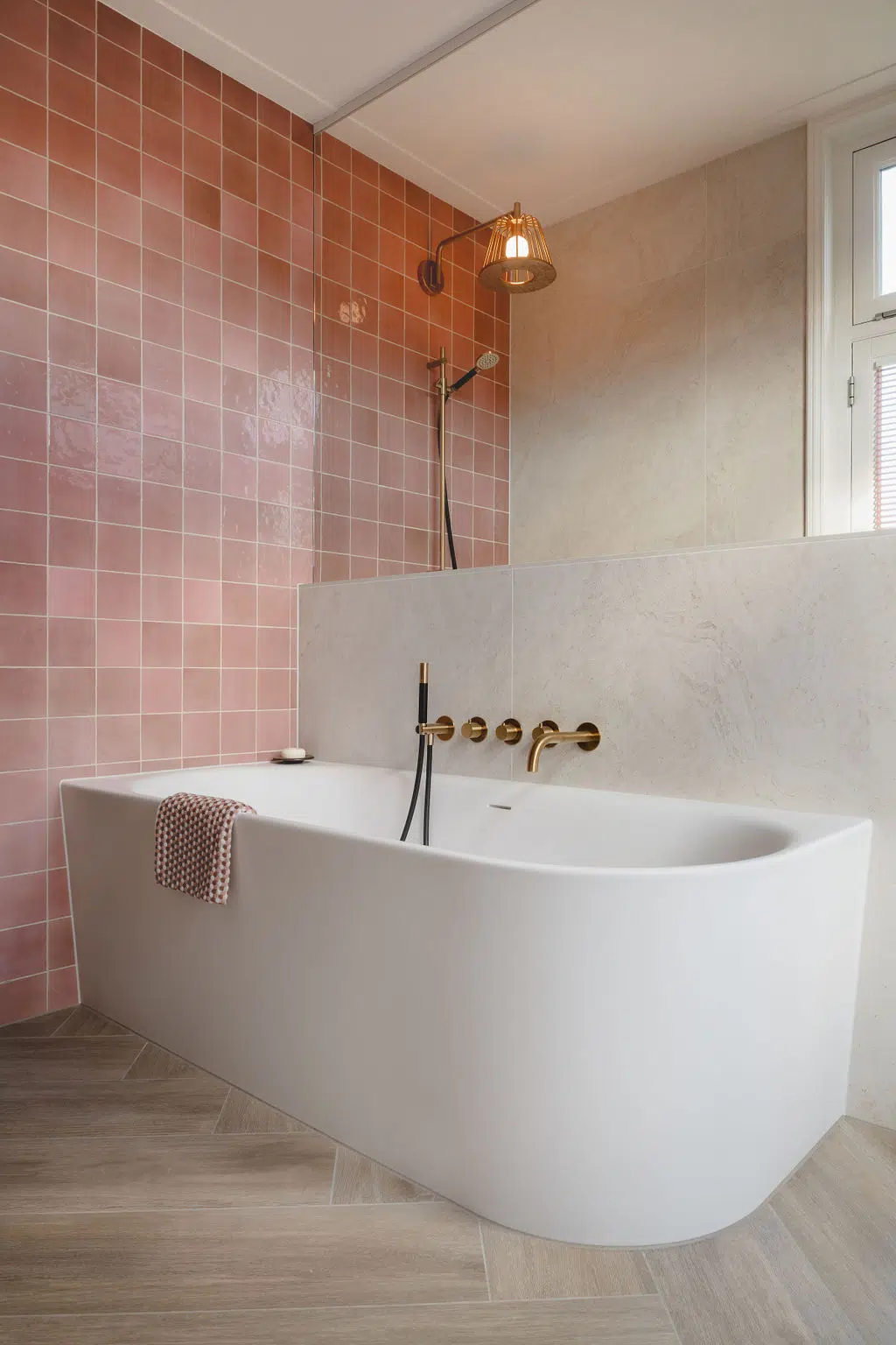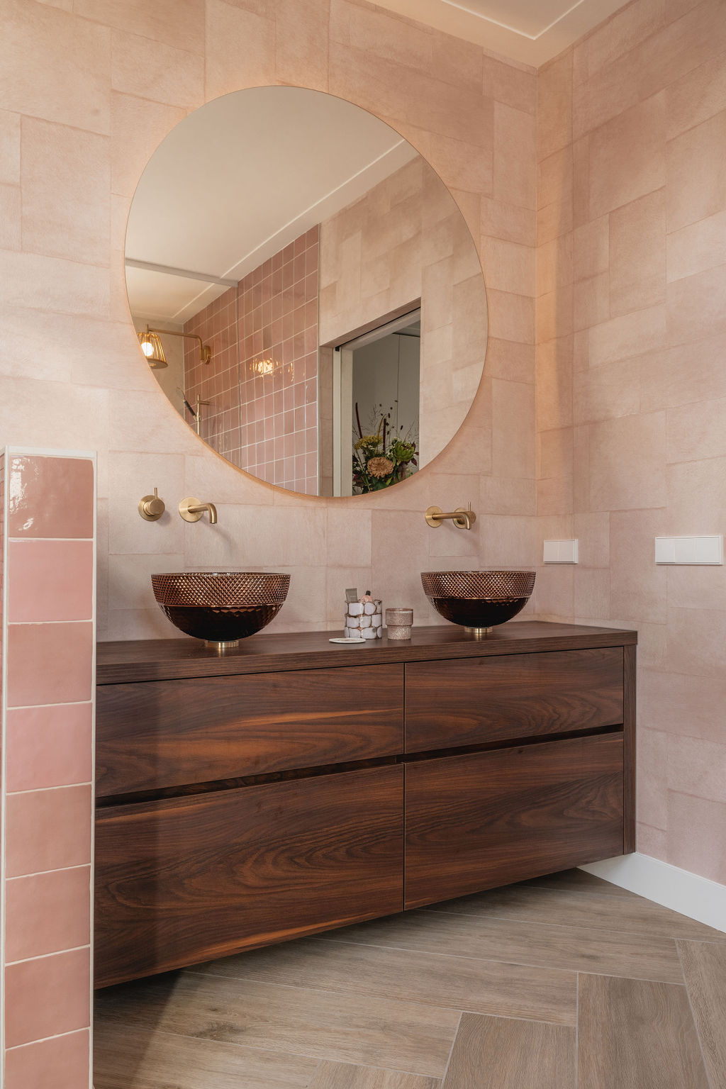“Bijzondere details zijn de glazen kristallen waskommen, de lampenkap douchekop en de Hotbath kranen in geborsteld messing. Deze elementen onderscheiden deze badkamer, net als het licht roze badkamer behang op de wand. In net weer een een andere tint dan de tegeltjes, waardoor het contrast mooi samenvalt. Een unieke finishing touch.”