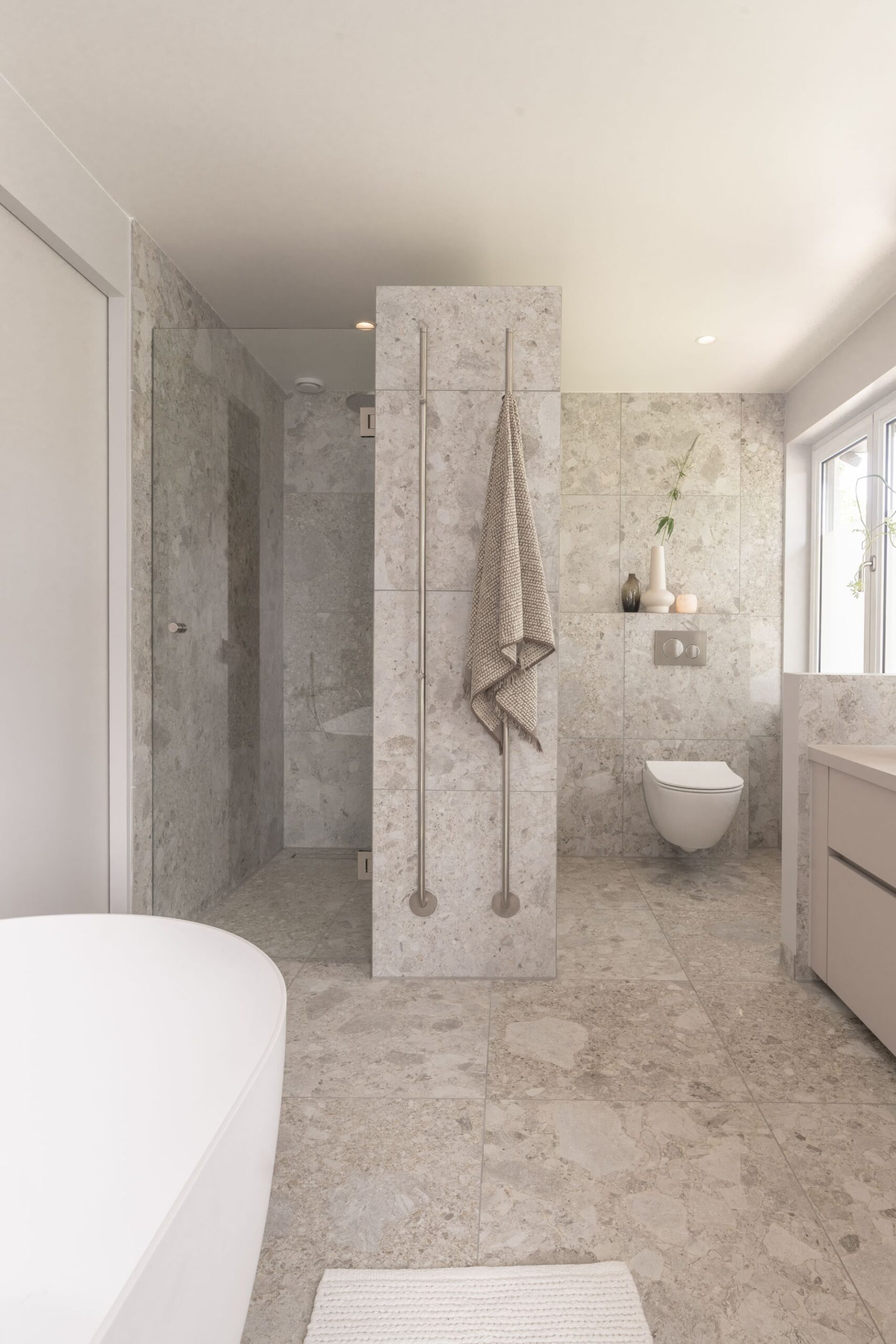 Een luxe, frisse badkamer die van alle gemakken is voorzien en waar design en natuurlijke materialen perfect samenkomen. Deze badkamer in Huizen ontwierp Niels voor de familie Burger uit Huizen. De luxe design badkamer is voorzien van een riant vrijstaand bad, een prachtige nis en een indrukwekkend badkamermeubel. Door de kleuren en materialen op elkaar aan te sluiten, ontstaat een heerlijke, ontspannen sfeer. Deze badkamer ademt natuur en rust uit.