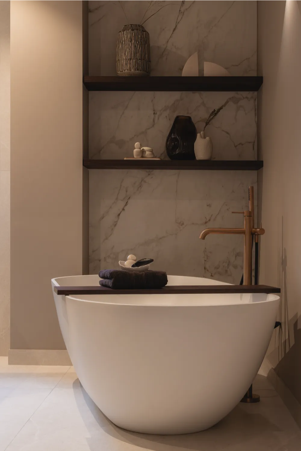 Een uniek detail is het vrijstaande bad, met daarachter een maatwerkkast bestaande uit een marmerprint plaat en houten planken. Dit geeft de badkamer een echt luxe gevoel. De walk-in-douche met regen- en spotdouche, gecombineerd met herhaling van de marmeren plaat, zorgt voor eenheid en harmonie in het ontwerp. Met de juiste styling vormen de meubels, kranen en marmeren details samen een perfect afgestemde badkamer waar design en functionaliteit hand in hand gaan.