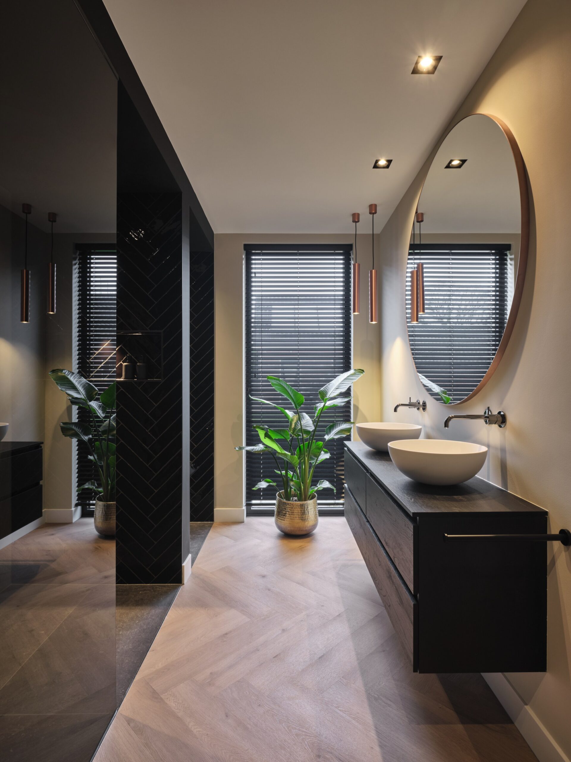 Elk detail in deze badkamer klopt. De luxe houtlook visgraatvloer maakt deze badkamer helemaal af en sluit mooi aan op de zwarte tegels in visgraatpatroon op de koof. De industriële tegels aan de wand in de inloopdouche zijn voorzien van ronde uitsparingen. Het luxe, hangende badkamermeubel maakt de ruimte optisch groter. Designlampen en luxe ronde waskommen maken het geheel perfect af.