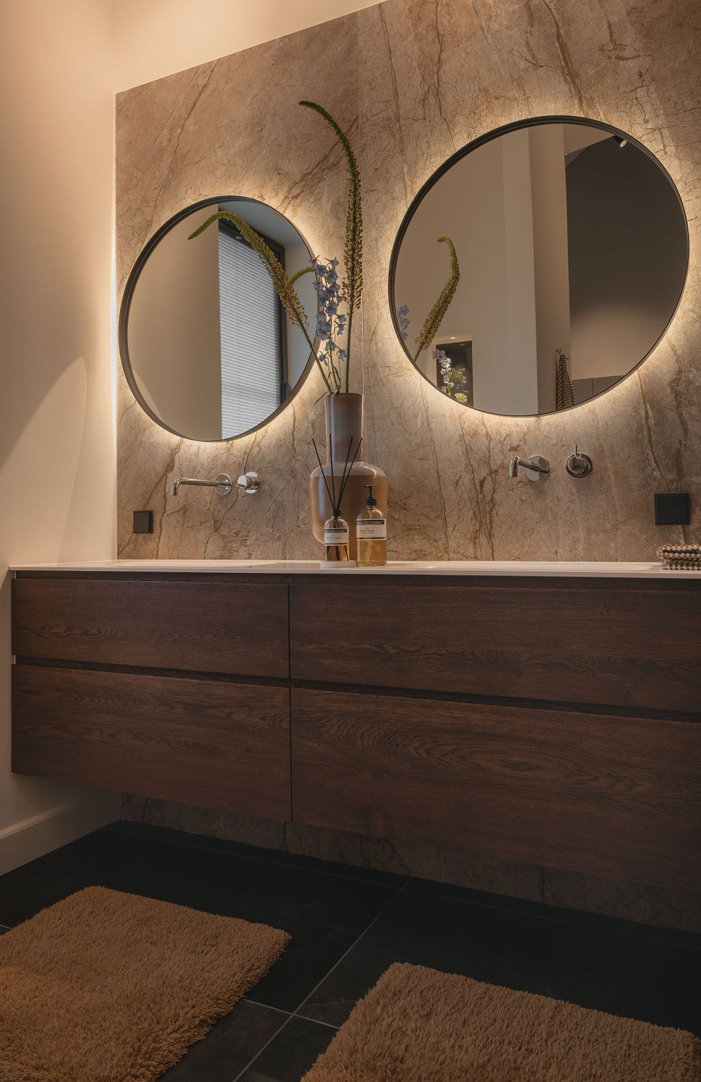 “Ramond en Saraya kozen voor warme aardse tinten achter het meubel, terwijl ze in de douche donkere kleuren wilden. Dit resulteerde in een prachtige combinatie van twee stijlen, binnen dezelfde ruimte. Er zijn stijlvolle slabs gebruikt in warme, donkere tinten.”