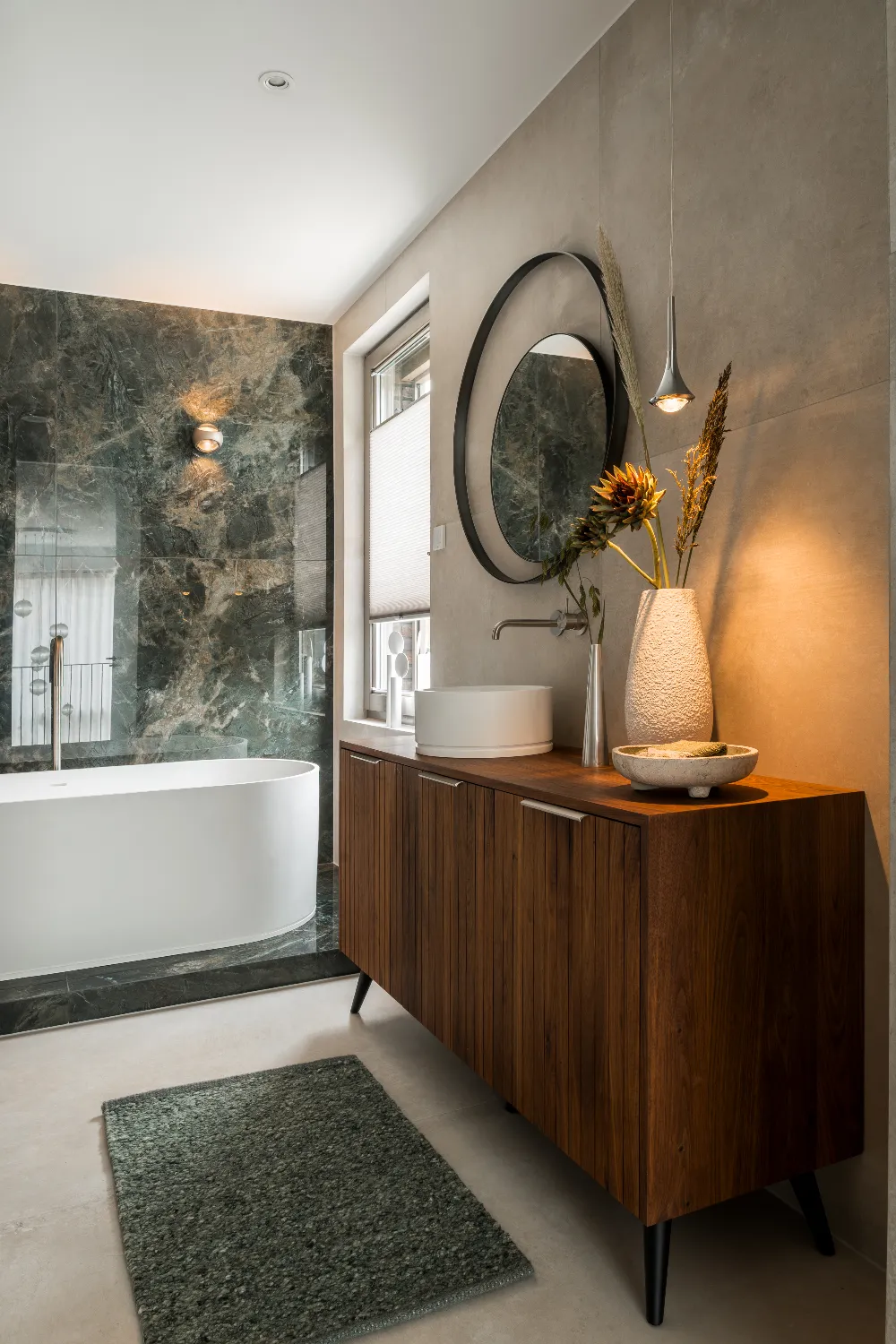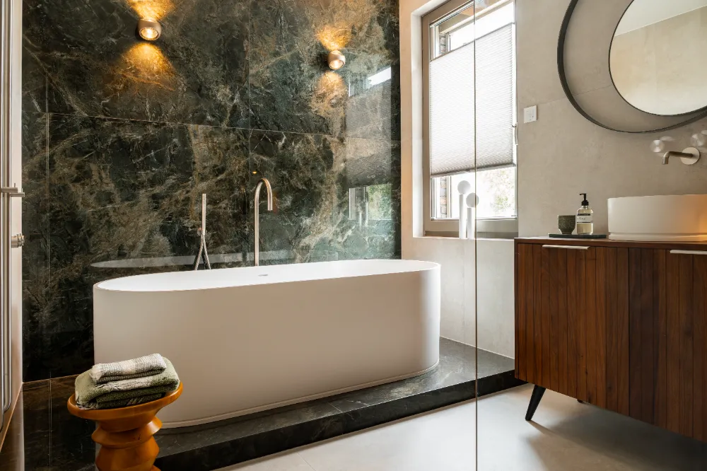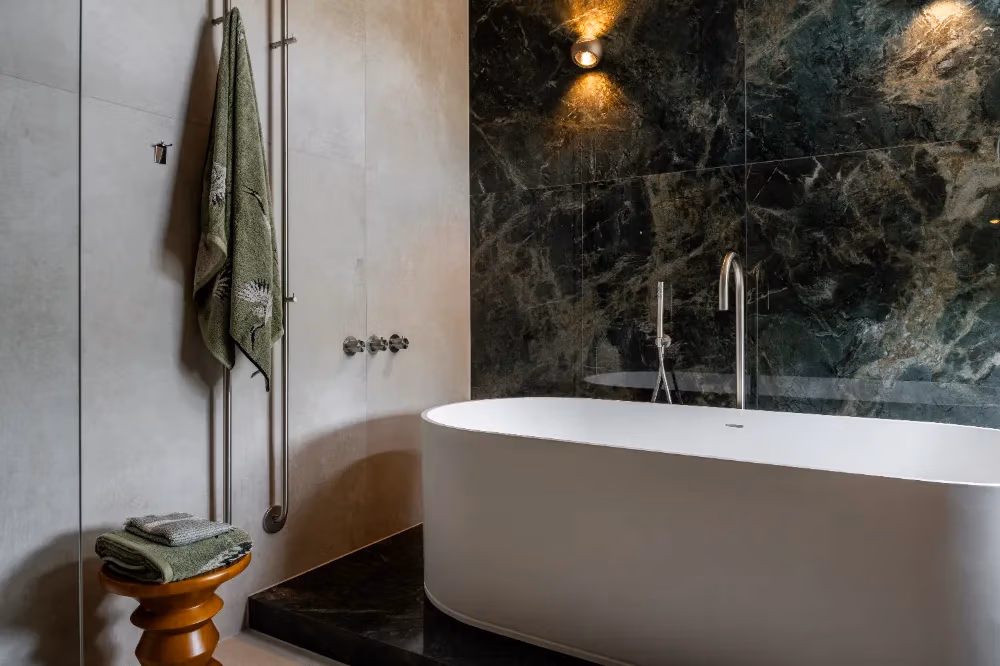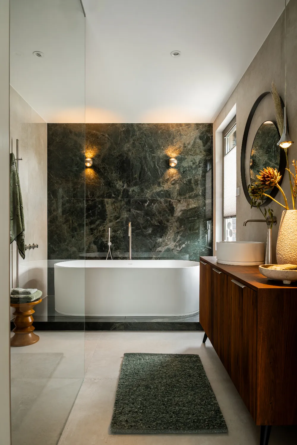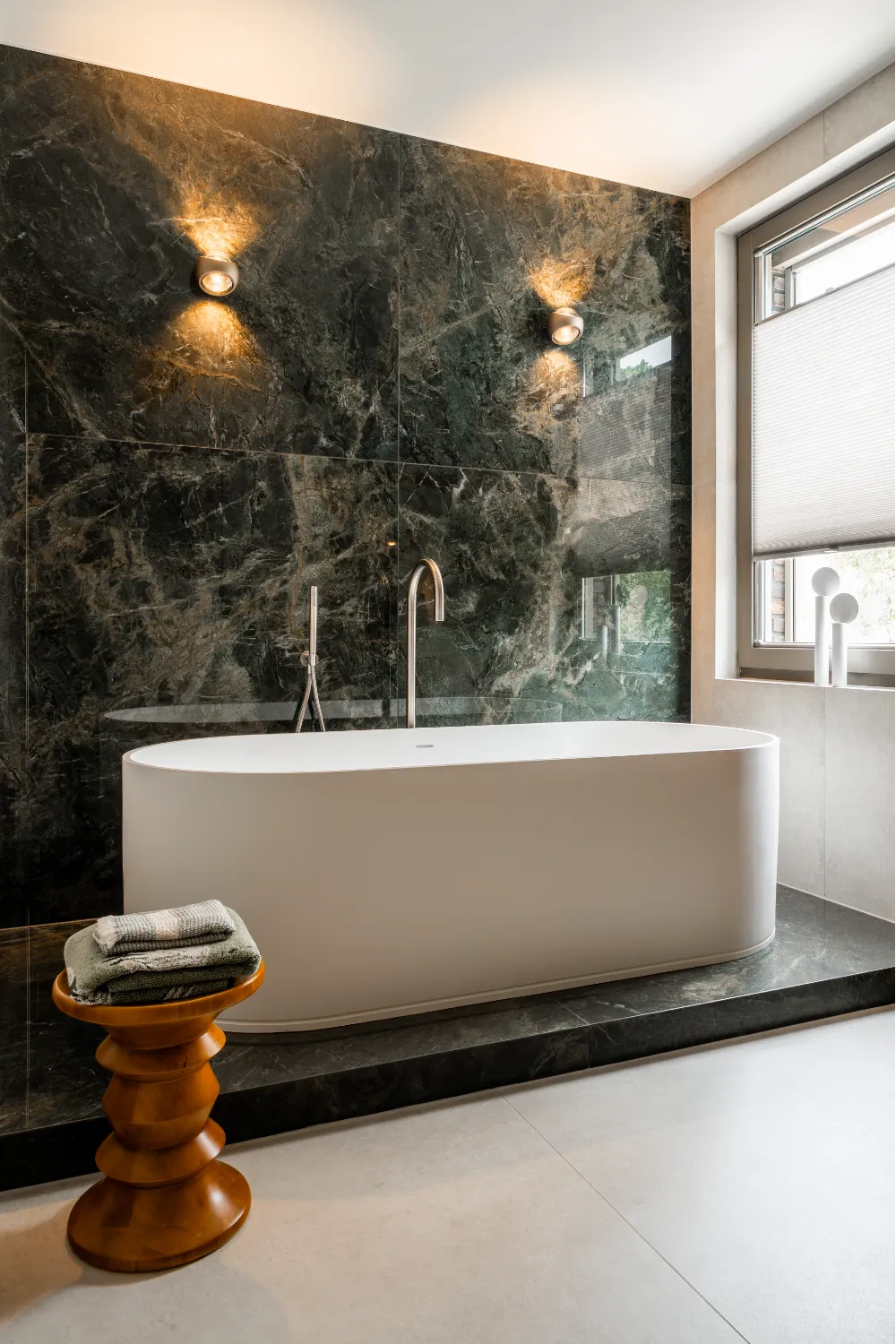 De grote tegels van 150×150 cm zorgen voor een rustig, bijna naadloos geheel, terwijl de verhoging voor het bad het interieur extra diepte en ruimtelijkheid geeft. Warme tinten en natuurlijke materialen worden afgewisseld met lichte naturellen en wit, waarbij de donker­groene wand- en vloerplaten achter en onder het bad voor een krachtige, elegante accentkleur zorgen.