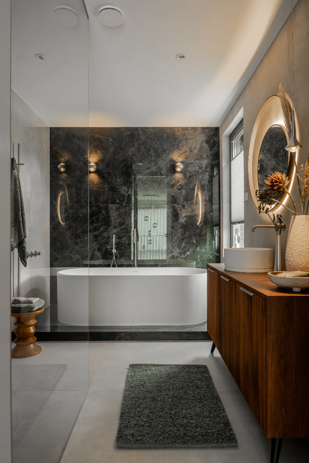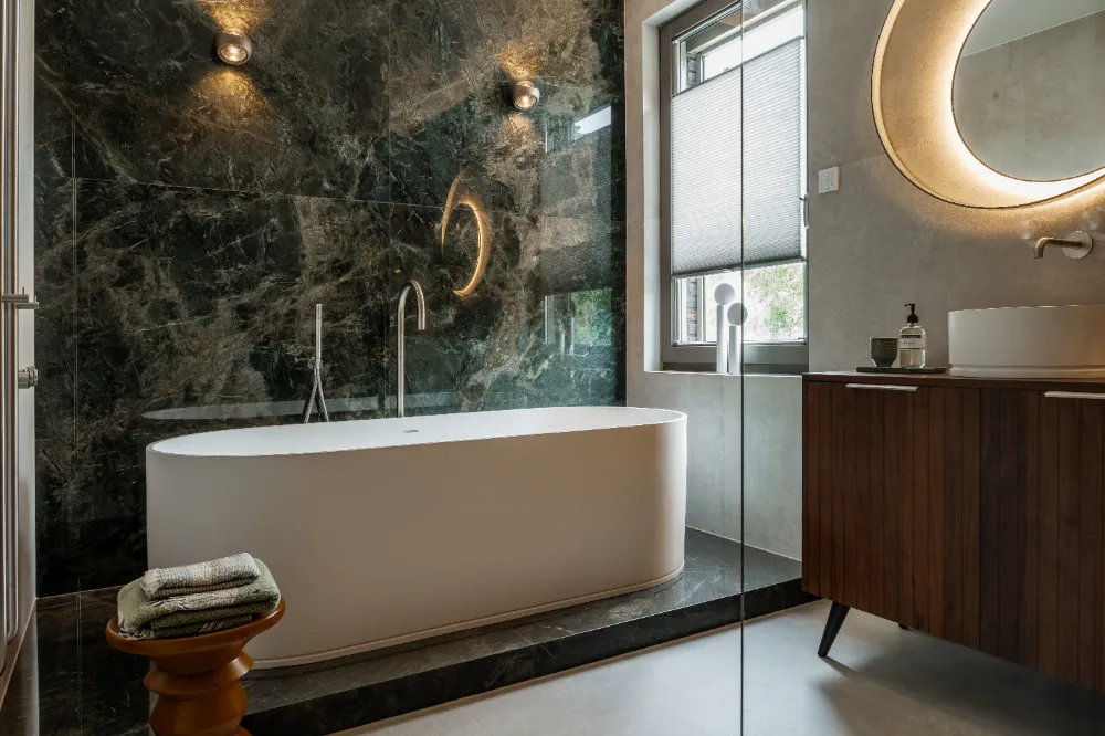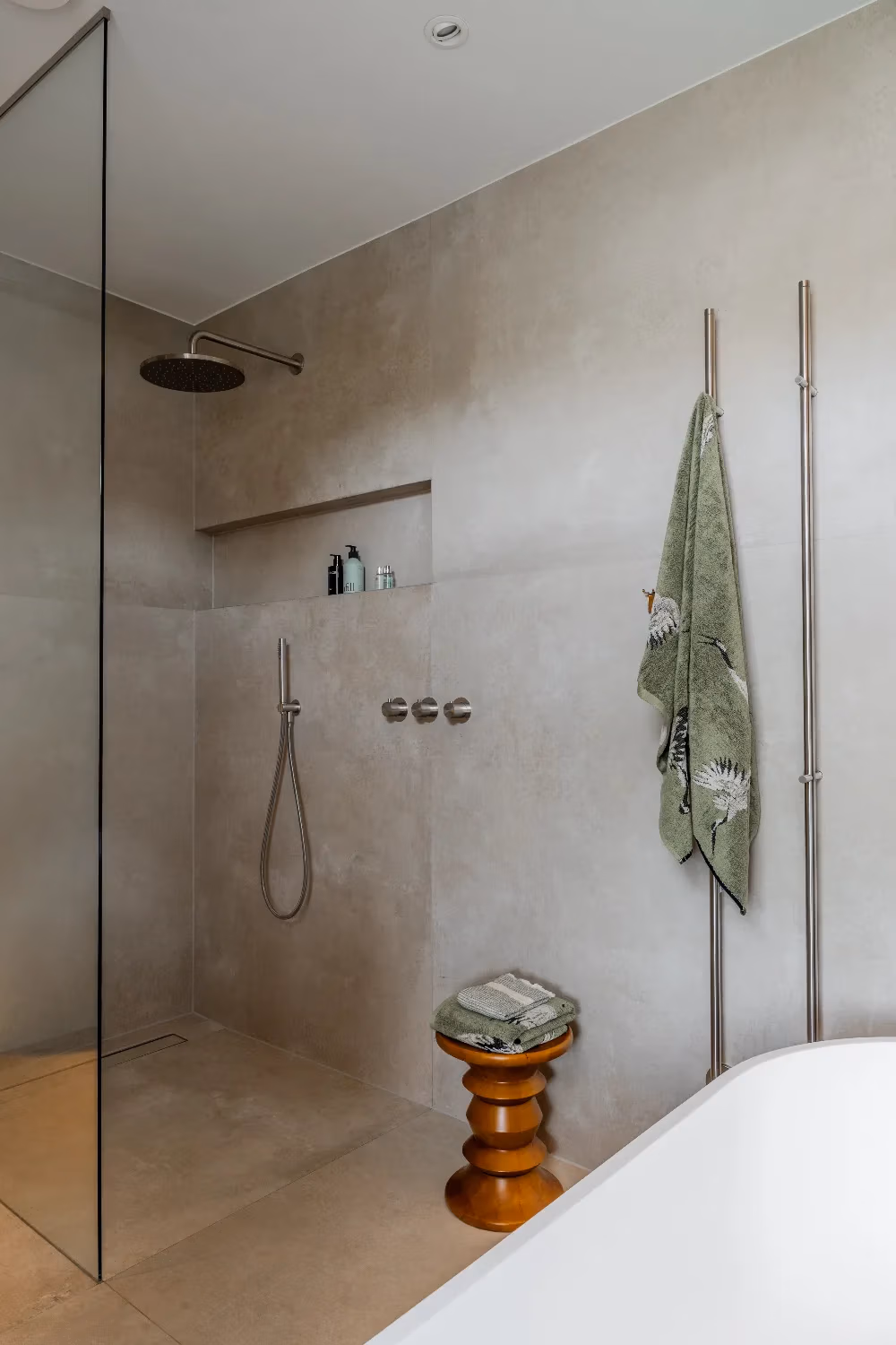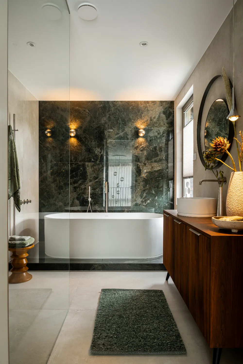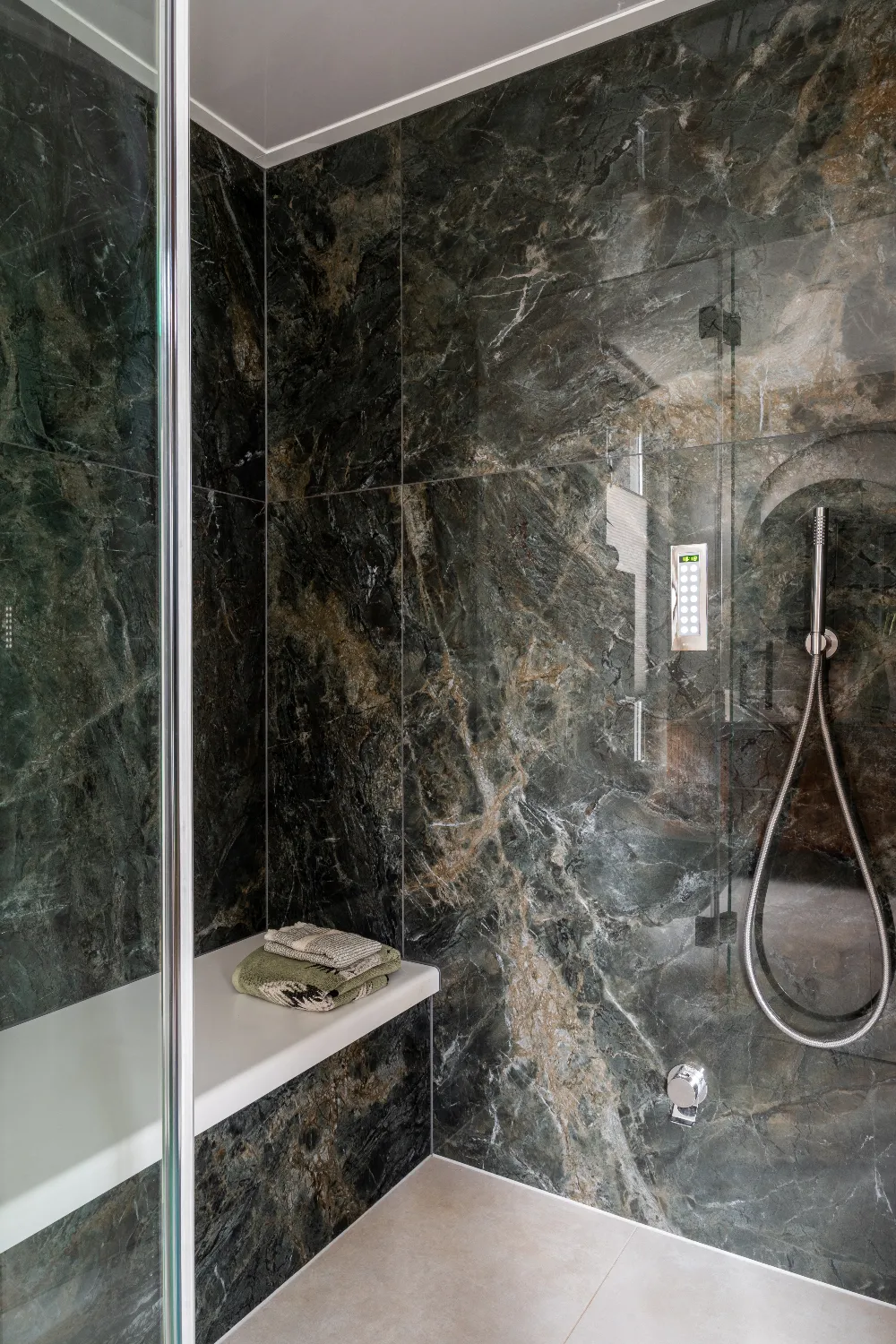 De grote tegels van 150×150 cm zorgen voor een rustig, bijna naadloos geheel, terwijl de verhoging voor het bad het interieur extra diepte en ruimtelijkheid geeft. Warme tinten en natuurlijke materialen worden afgewisseld met lichte naturellen en wit, waarbij de donker­groene wand- en vloerplaten achter en onder het bad voor een krachtige, elegante accentkleur zorgen.