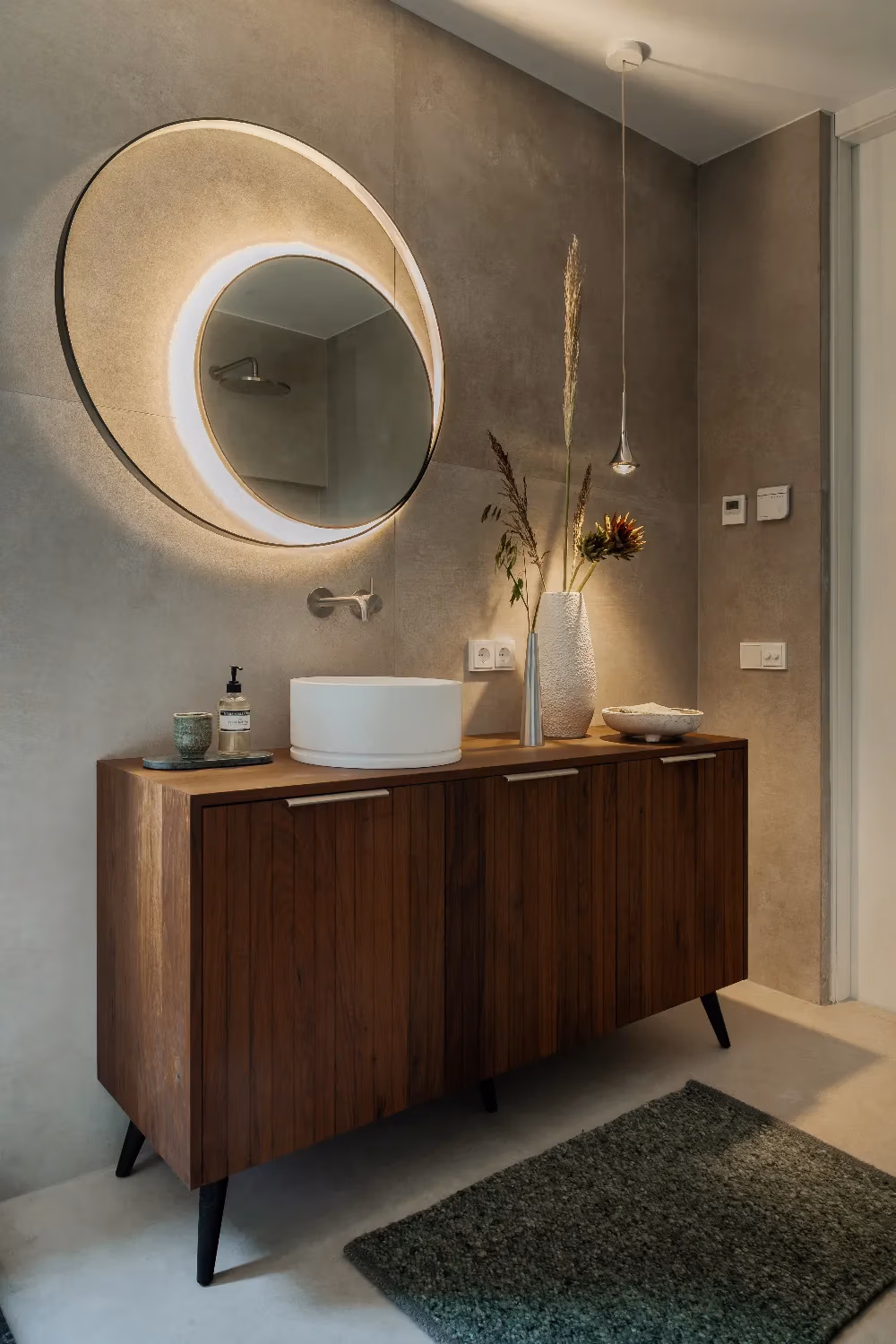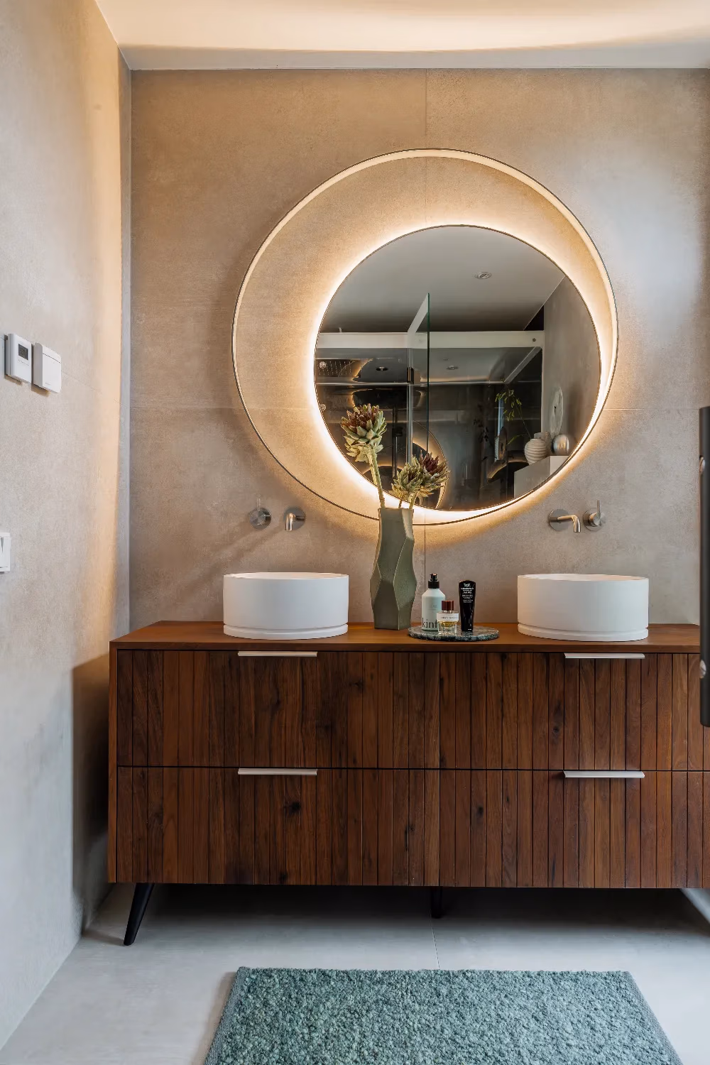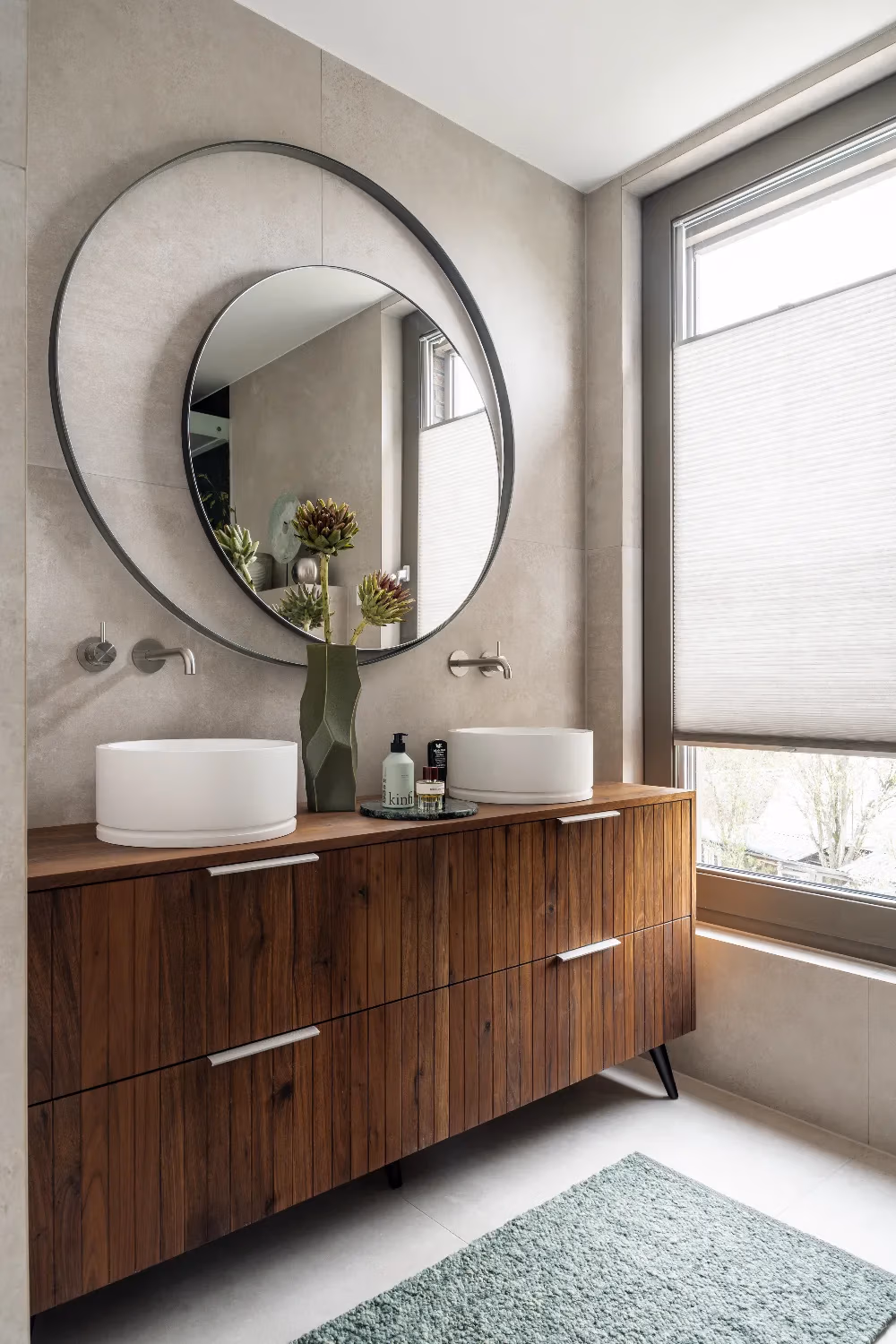 Samen met onze adviseur ontwikkelden we een volledig eigen ontwerp. We kozen bewust voor grote tegels van 150×150 cm en voor een verhoging waarop het bad is geplaatst, om een ruimtelijk en bijzonder effect te creëren. Het notenhouten meubel en de bijzondere spiegels zorgden voor de unieke uitstraling waar we naar op zoek waren. Alle materialen zijn zorgvuldig op elkaar afgestemd, waardoor beide badkamers een harmonieus geheel vormen.
