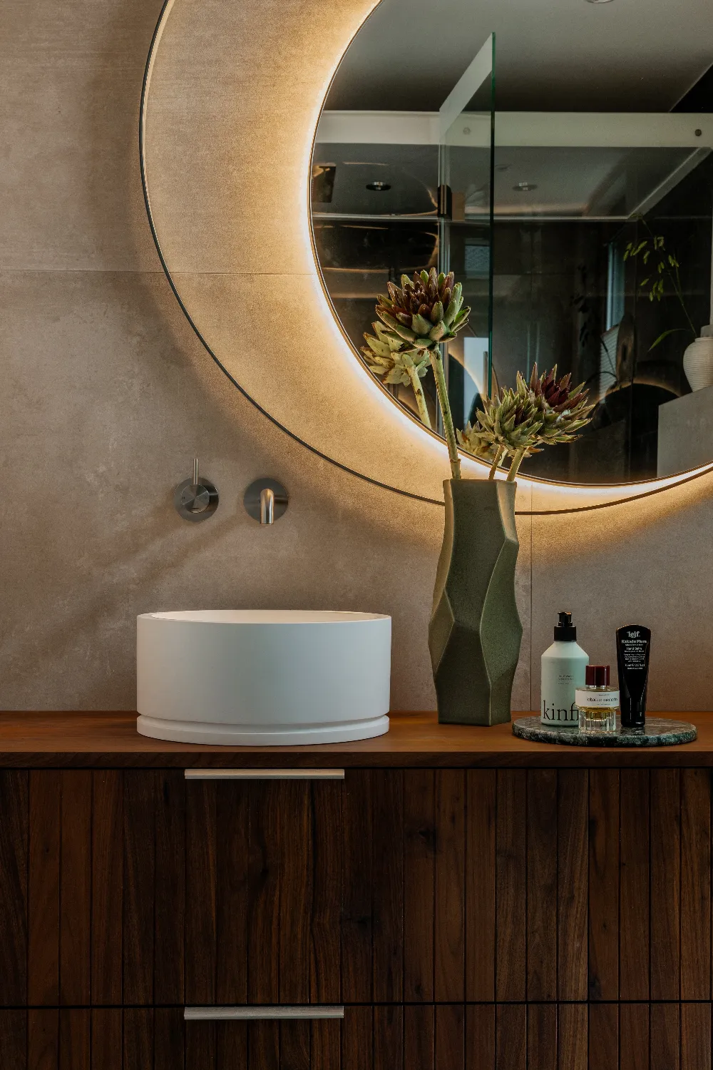 Voor familie Scholten zijn twee badkamers gerealiseerd die gekenmerkt worden door een stijlvolle en warme vormgeving. De badkamers hebben een zachte, harmonieuze uitstraling dankzij de ronde vormen die terugkomen in de spiegels, het vrijstaande bad en de waskommen. De houten wastafels op slanke pootjes geven het dressoir een luxe uitstraling.