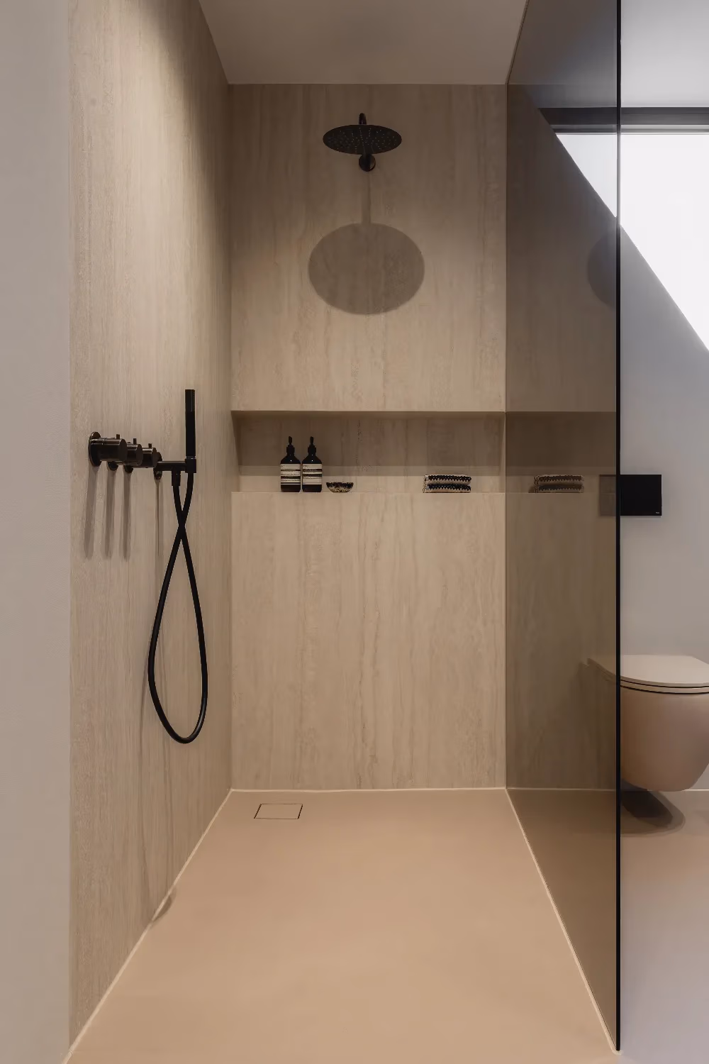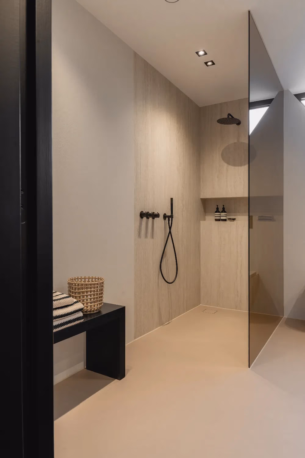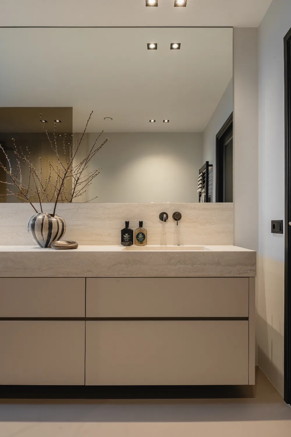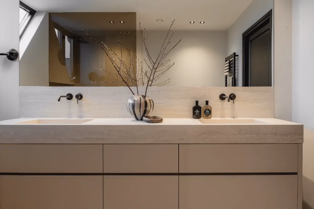Het blad en de wasbakken zijn vervaardigd uit travertin, een materiaal dat ook terugkomt in de douchewanden. Voor een extra contrast en meer pit zijn zwarte kranen en een zwarte handdoekenradiator gekozen, wat perfect past bij het strakke lijnenspel van de badkamer. Het kozijn voegt een verrassende touch toe en benadrukt het design van de ruimte, waardoor de badkamer een echte moderne uitstraling krijgt.
