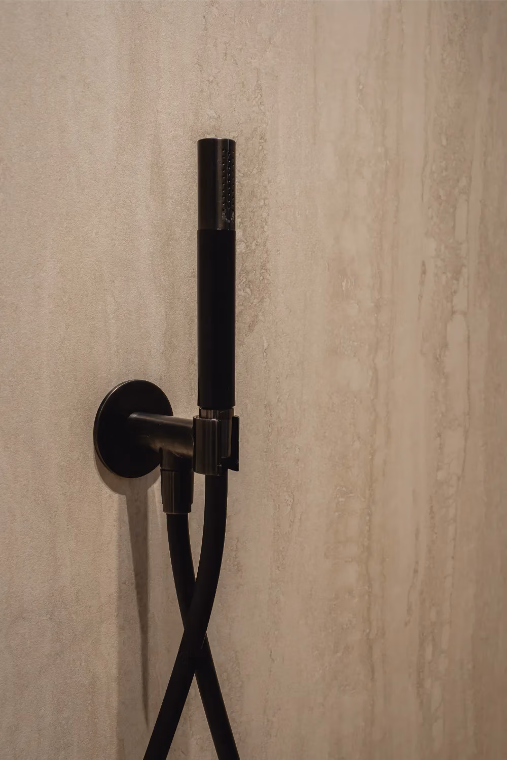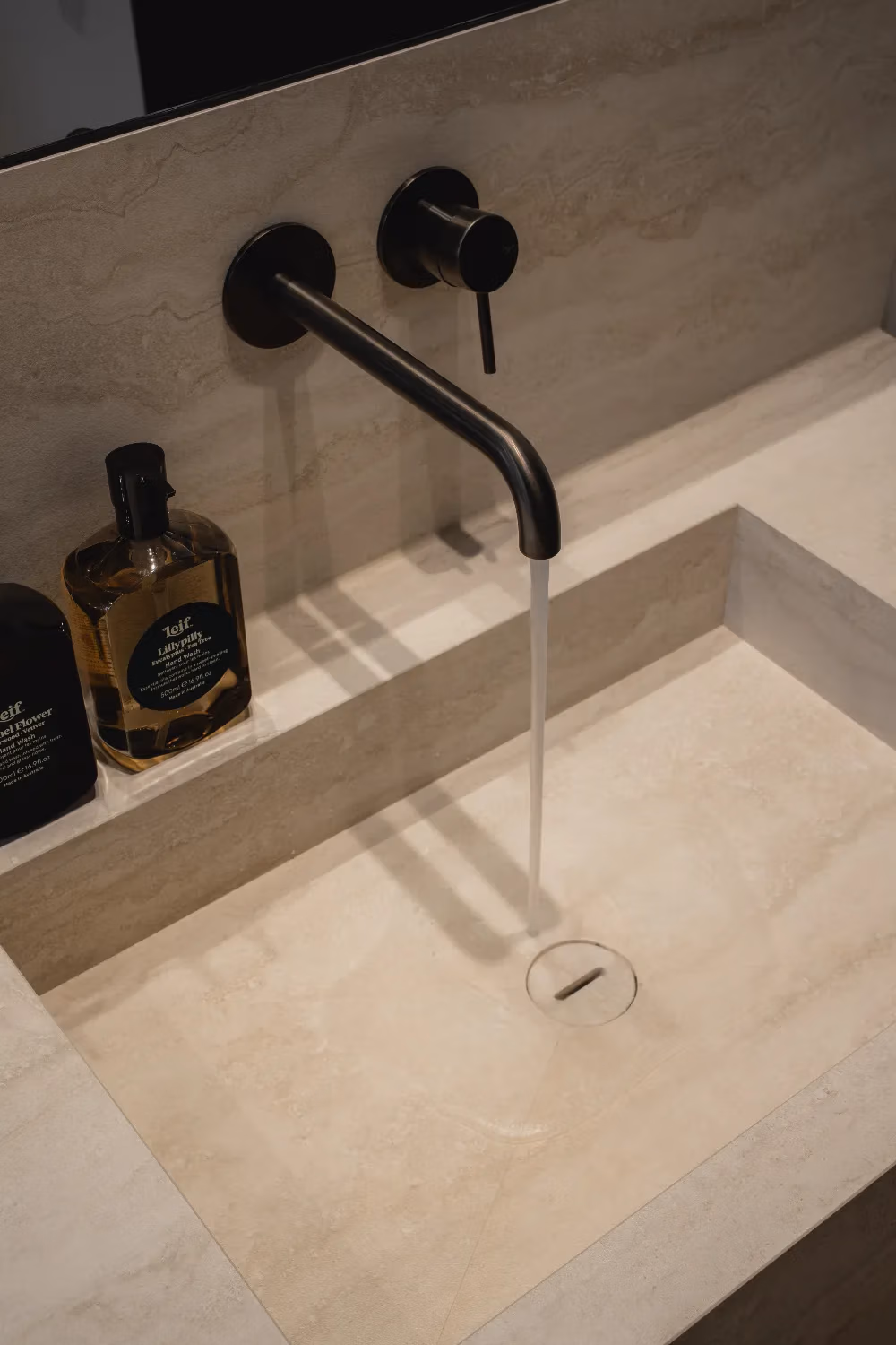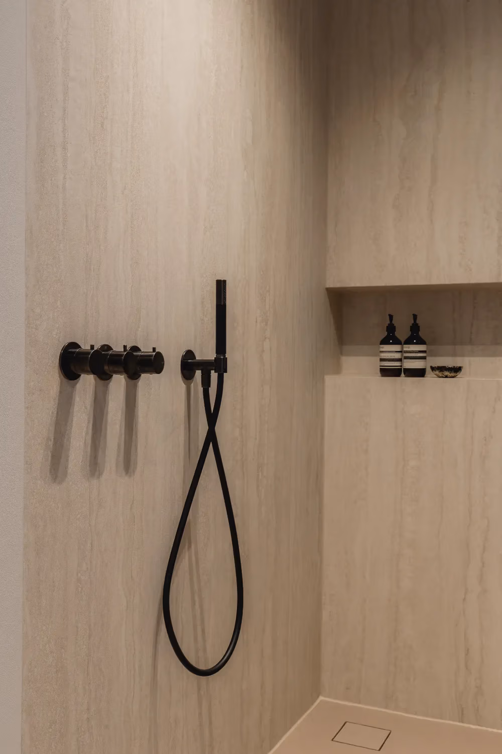 Het blad en de wasbakken zijn vervaardigd uit travertin, een materiaal dat ook terugkomt in de douchewanden. Voor een extra contrast en meer pit zijn zwarte kranen en een zwarte handdoekenradiator gekozen, wat perfect past bij het strakke lijnenspel van de badkamer. Het kozijn voegt een verrassende touch toe en benadrukt het design van de ruimte, waardoor de badkamer een echte moderne uitstraling krijgt.