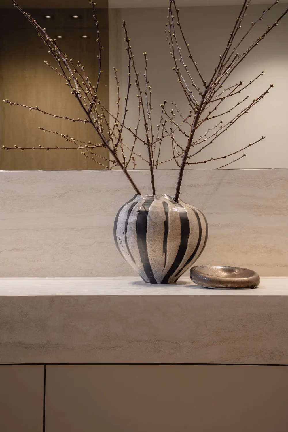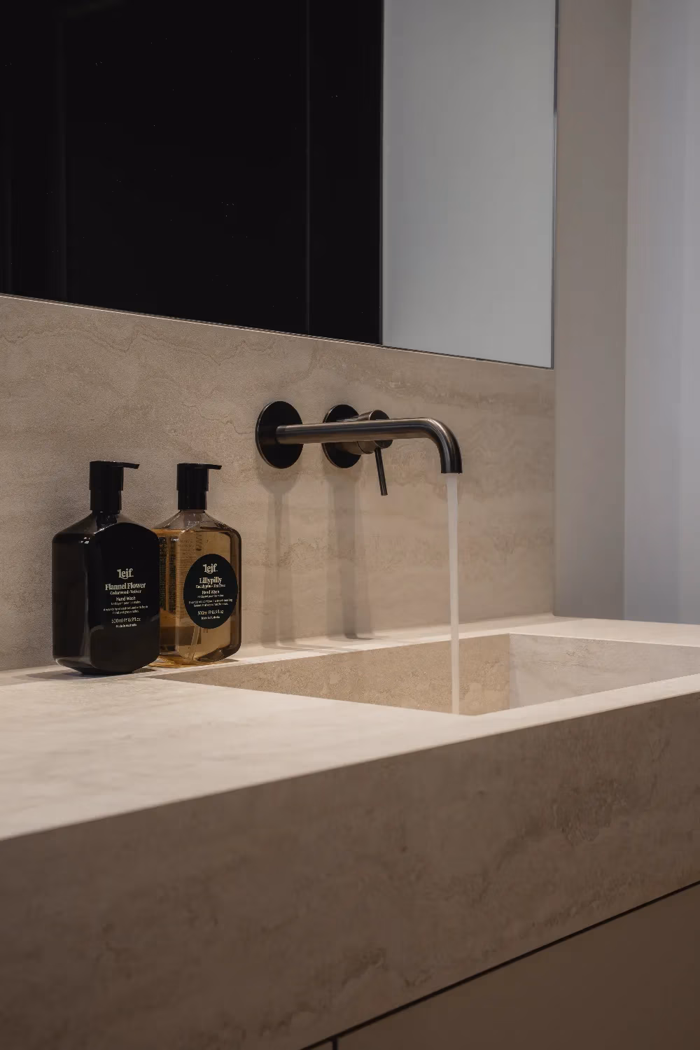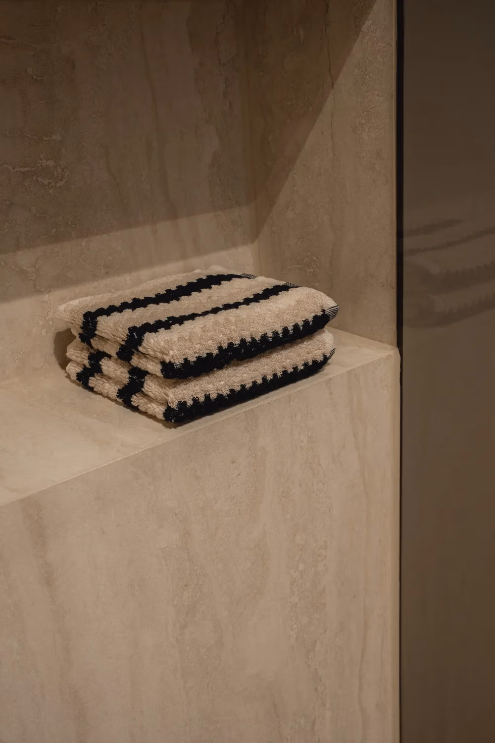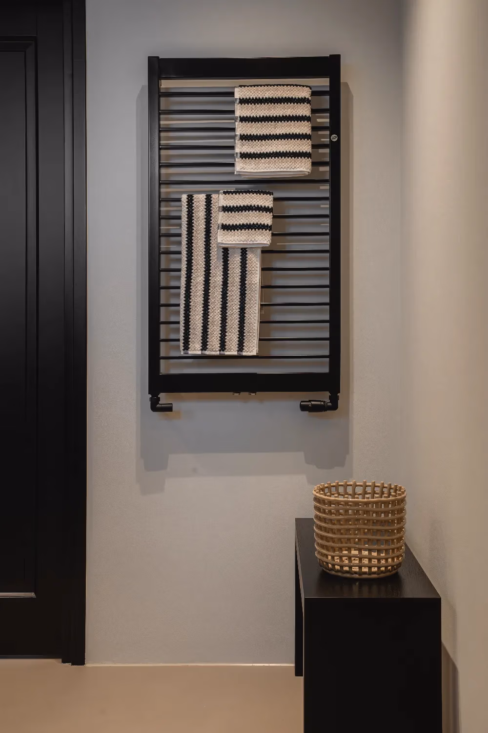 Het blad en de wasbakken zijn vervaardigd uit travertin, een materiaal dat ook terugkomt in de douchewanden. Voor een extra contrast en meer pit zijn zwarte kranen en een zwarte handdoekenradiator gekozen, wat perfect past bij het strakke lijnenspel van de badkamer. Het kozijn voegt een verrassende touch toe en benadrukt het design van de ruimte, waardoor de badkamer een echte moderne uitstraling krijgt.