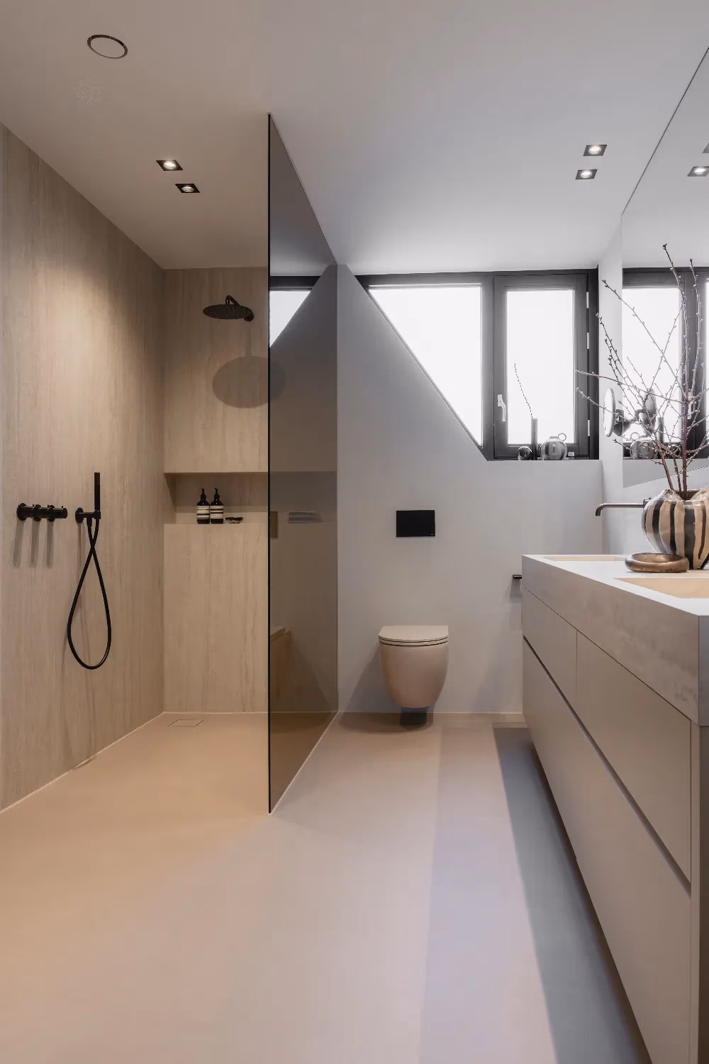 “De heer en mevrouw van de Vuurst kwamen bij De Eerste Kamer met duidelijke ideeën over hun nieuwe badkamer. Ze wilden grote slabs combineren met stucwerk, waardoor de ruimte één stijlvol geheel zou vormen. De ruime inloopdouche met glazen wand draagt bij aan een moderne uitstraling en sluit naadloos aan bij hun wensen.