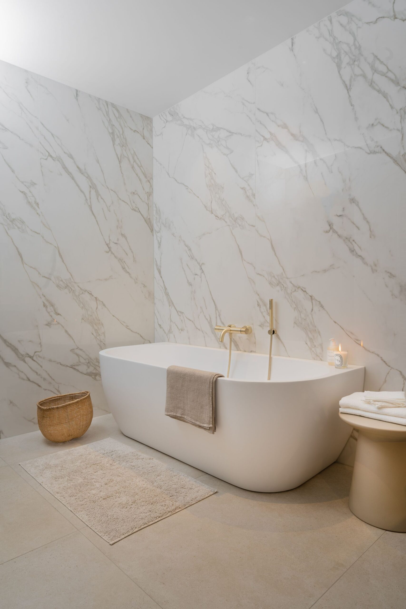 Grote marmeren badkamertegels stonden hoog op de wensenlijst van deze klant. Daar heeft badkamerontwerper Niels uiteraard naar geluisterd. Samen met de familie Beusekom ging hij op zoek naar zo groot mogelijke marmeren tegels. De marmeren tegels hebben een subtiele beadering die het licht mooi weerkaatst en doorlopen in de volgende tegel, dit heet chain match en zorgt voor een rustig en harmonieus effect.