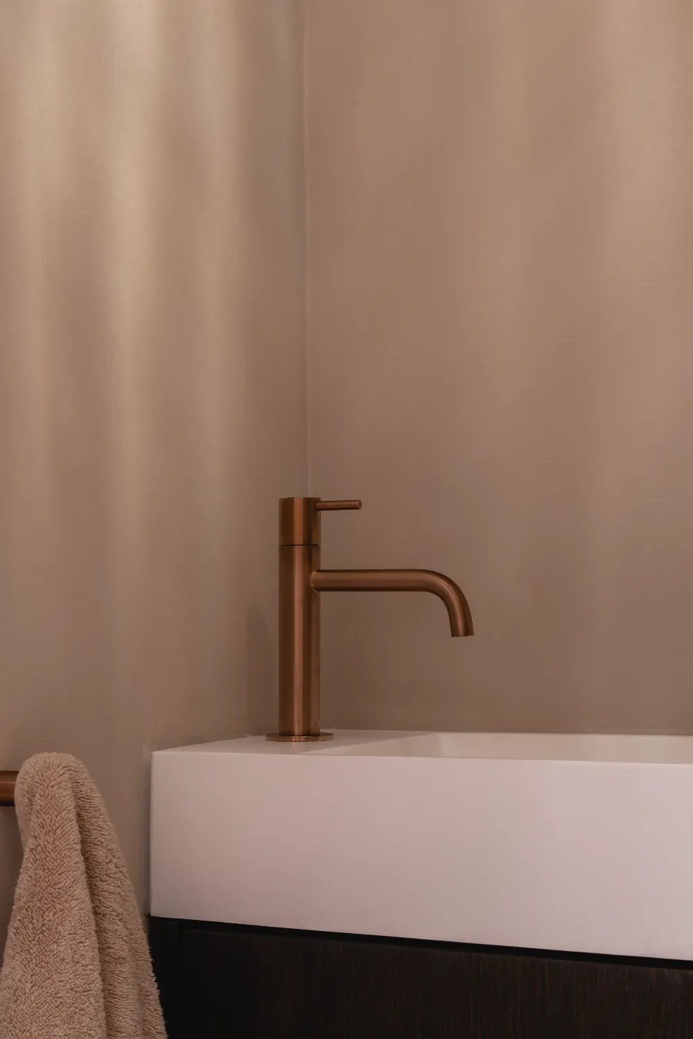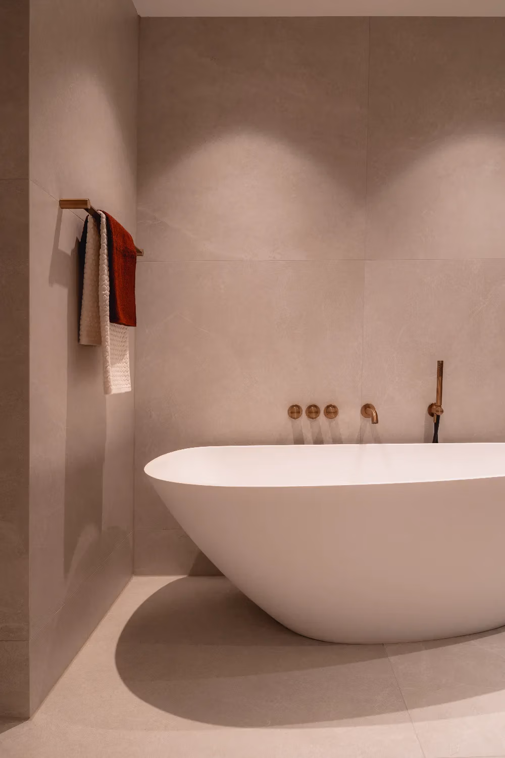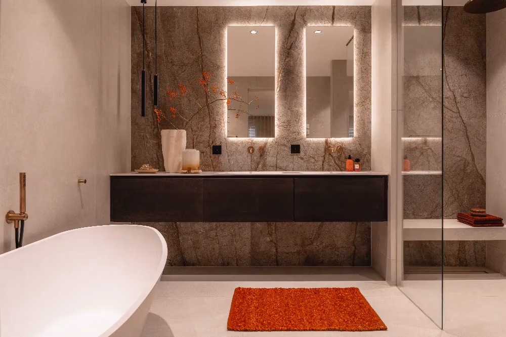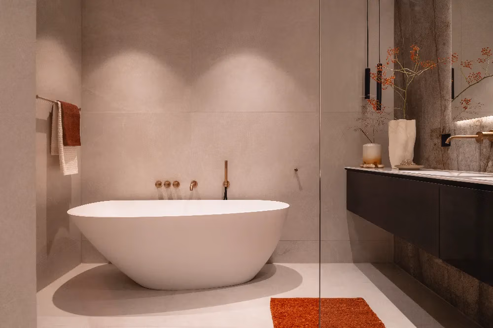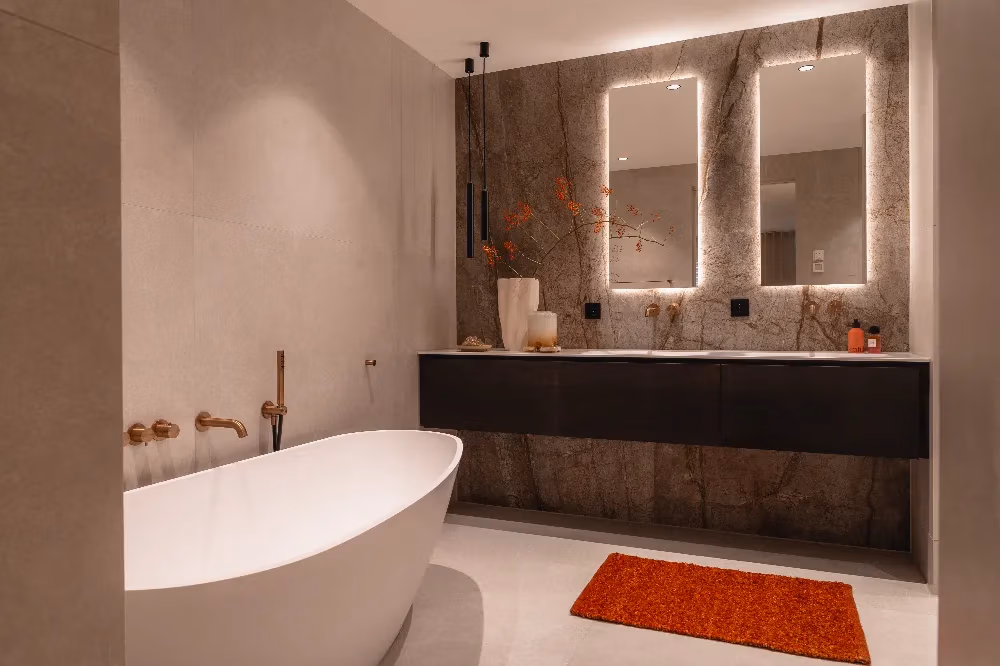 In de showroom stond een opstelling die we ontzettend mooi vonden en die als uitgangspunt heeft gediend voor ons ontwerp. We hebben hier een paar aanpassingen op gedaan, zoals het kiezen voor een losstaand bad in plaats van een ingebouwd bad. Verder kozen we wandtegels met een warme tint, omdat ze prachtig aansluiten bij het hout van het meubel.
