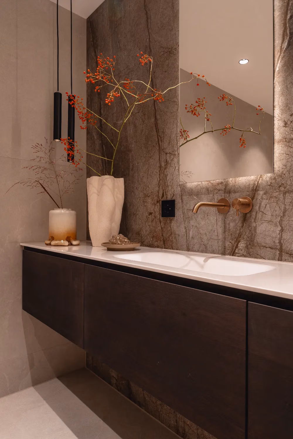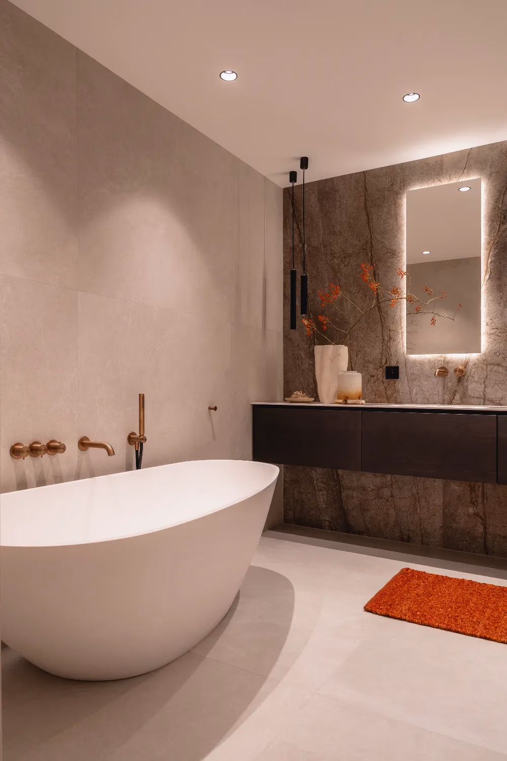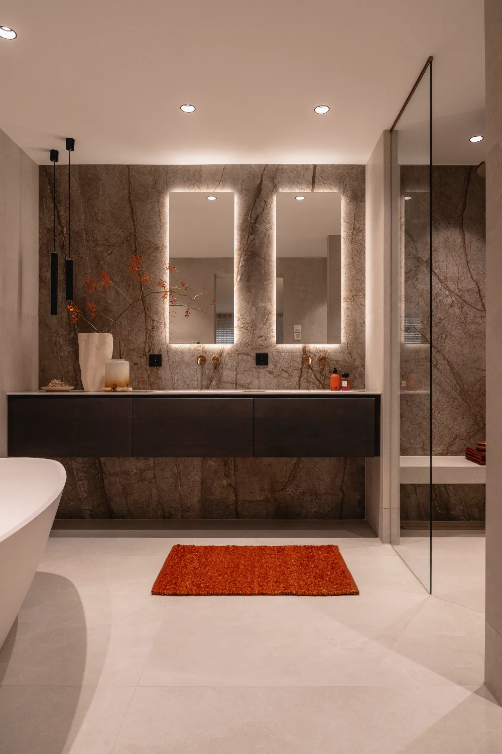 De indeling van de badkamer is royaal en doordacht, met ruimte voor een indrukwekkend badkamermeubel van maar liefst 230 cm breed. Een bijzonder detail zijn de ingebouwde nisjes boven het toilet, vormgegeven als een kast. Deze herhaling van het meubelontwerp versterkt de eenheid in de ruimte en creëert een exclusieve uitstraling. De verlichting rondom de spiegels, in hanglampen en nisjes zorgt voor warmte en diepte, terwijl de accessoires perfect aansluiten bij de bronze accenten en marmeren wandplaten.