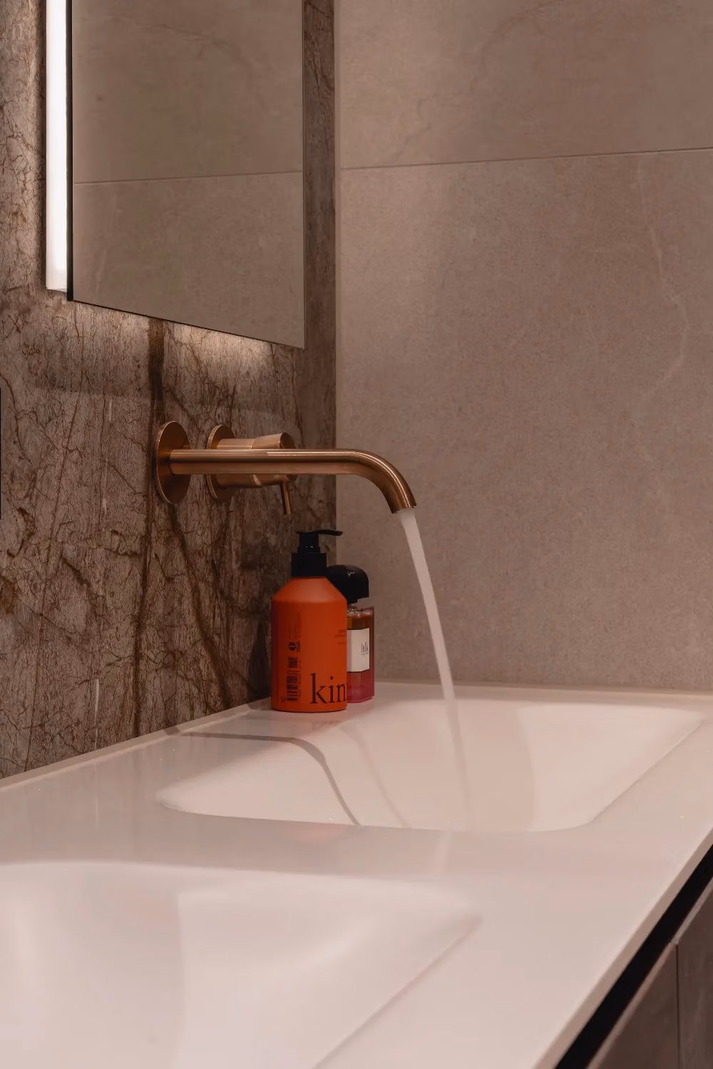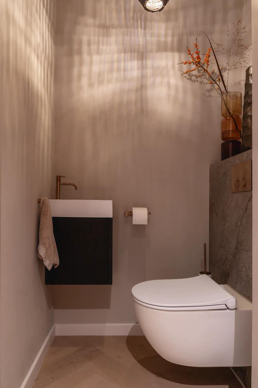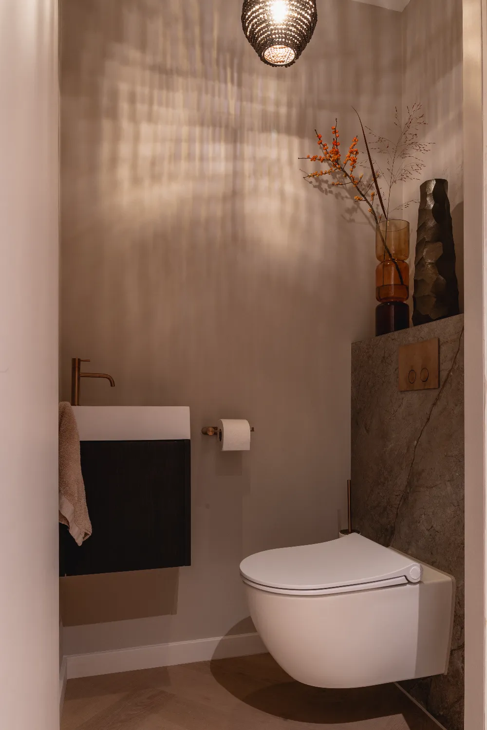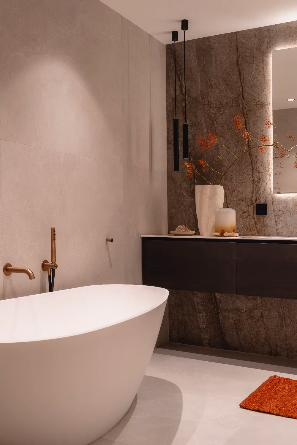 De indeling van de badkamer is royaal en doordacht, met ruimte voor een indrukwekkend badkamermeubel van maar liefst 230 cm breed. Een bijzonder detail zijn de ingebouwde nisjes boven het toilet, vormgegeven als een kast. Deze herhaling van het meubelontwerp versterkt de eenheid in de ruimte en creëert een exclusieve uitstraling. De verlichting rondom de spiegels, in hanglampen en nisjes zorgt voor warmte en diepte, terwijl de accessoires perfect aansluiten bij de bronze accenten en marmeren wandplaten.