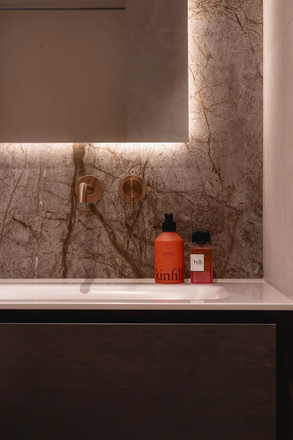 Deze luxe Hotel Chique badkamer ademt een stijlvolle sfeer. Het samenspel van diepe zwarttinten, marmeren wandplaten en de warme bronze-kleurige Gessi-kranen zorgt voor een elegant contrast. Voor de familie Ter Maten resulteert dit in een elegant geheel dat luxe uitstraalt en warmte biedt. Door het gebruik van hoogwaardige materialen en een rustige basis ontstaat een verfijnd geheel dat sfeer en diepte versterkt.
