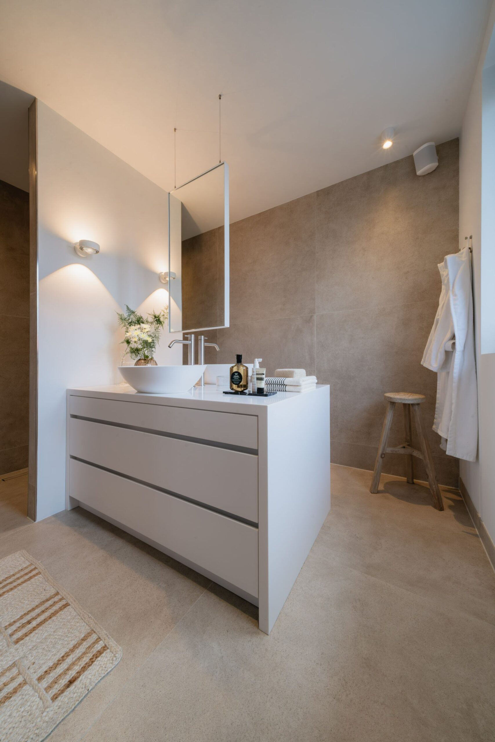 In de eerste badkamer straalt een unieke dubbelzijdige hangende spiegel met wit stalen omlijstingen, terwijl het super chique wastafeleiland met opberglades de ruimte opent en een gevoel van ruimtelijkheid creëert. De keuze voor ovale opzetwastafels en kranen van het designer merk HotBath in RVS kleur geeft een exclusieve uitstraling. De strakke keramische beige tegels vormen een harmonieus geheel dat rust en stijl uitstraalt.