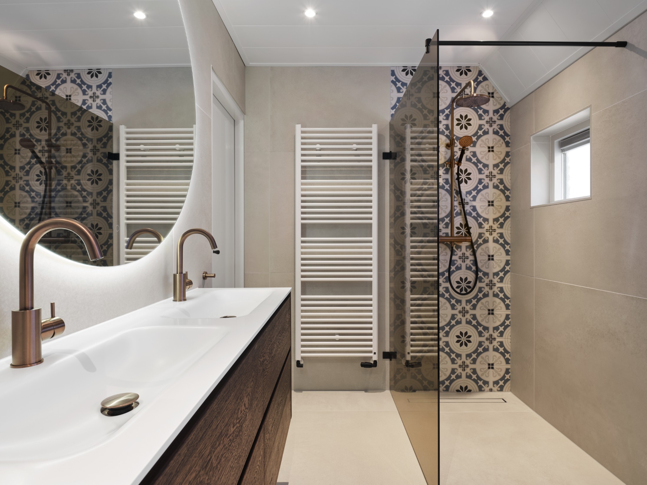 “De familie Schut woont in een prachtige woonboerderij in Wekerom. Tegels vormden de inspiratie voor het ontwerp van deze badkamer. Familie Schut stond open voor het idee om warmte en sfeer toe te voegen in het ontwerp.”