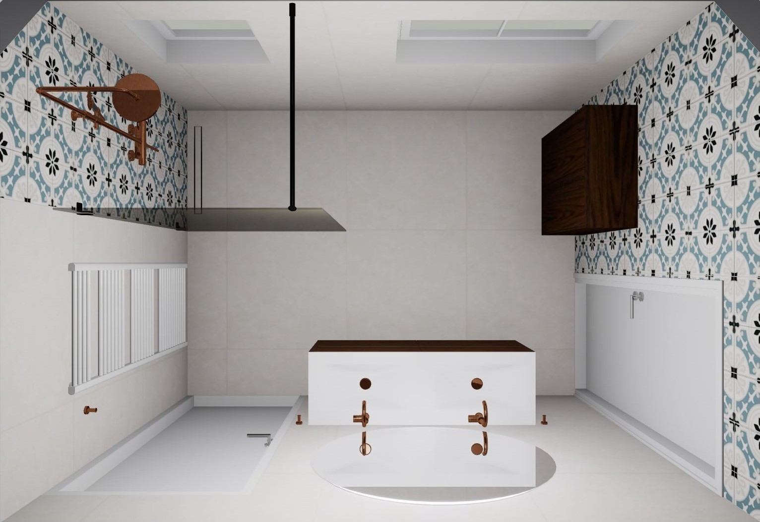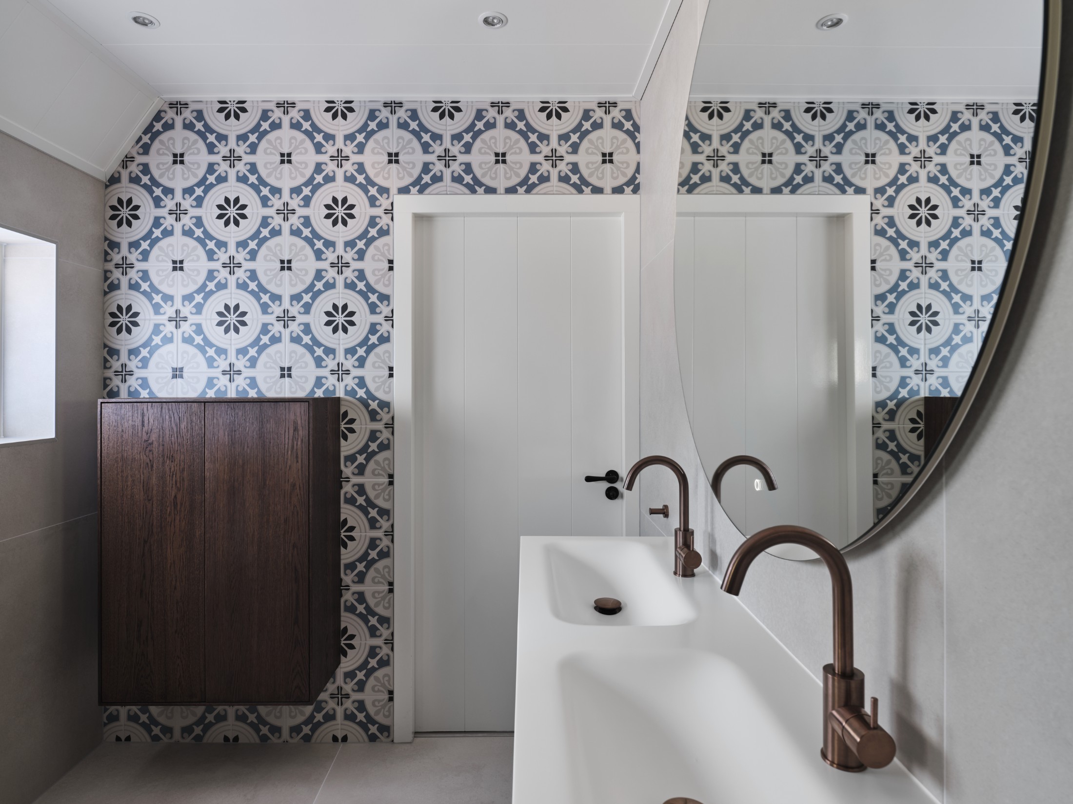 “Naast de koele blauwtinten van de tegels heb ik gekozen voor een donker massief houten badkamermeubel. De bronzen kranen vormen een mooi geheel met dit meubel.”