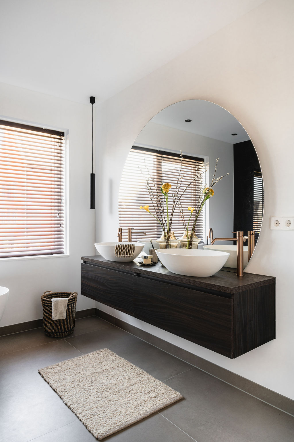 Voor hun nieuwbouwhuis in Almere heeft de familie De Jong twee design badkamers laten ontwerpen. De master badkamer heeft een rustige basis van lichte vloertegels en strak gestucte muren. Zodra je de hoek omgaat, ervaar je een luxe inloopdouche met een wandafwerking van marmeren plaat tegels. De kraan en thermostaat in geborsteld koper geven de doucheruimte meer warmte. Deze kleur kraan vinden we terug in de hele badkamer, wat voor harmonie zorgt. Ronde vormen, zoals de spiegel boven het meubel, de waskommen en het vrijstaande ovaal bad, geven de badkamer elegantie en comfort.