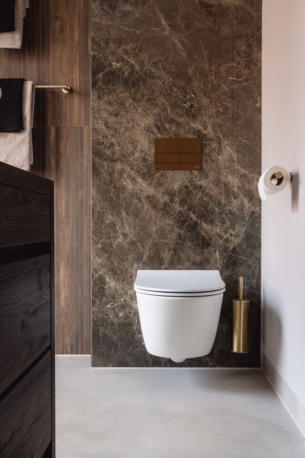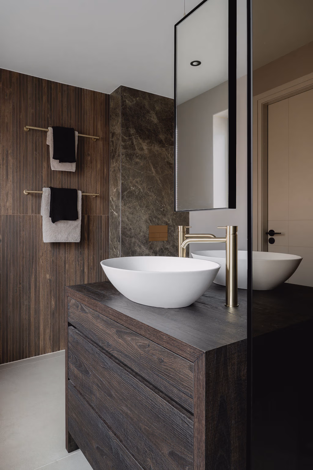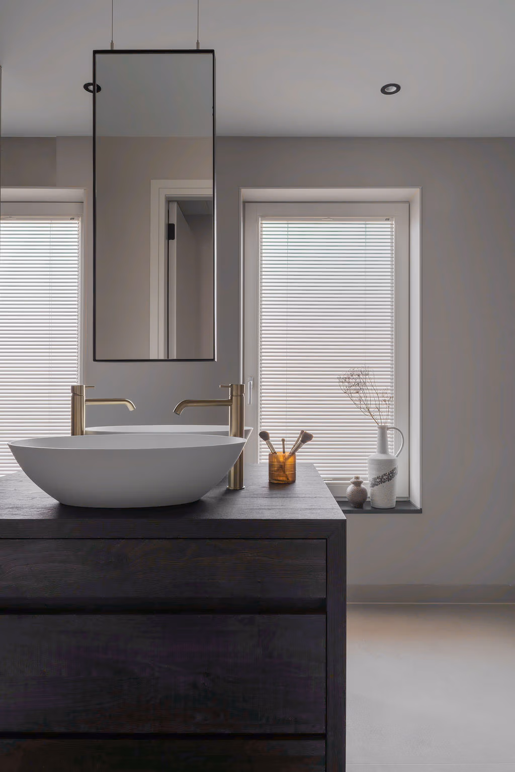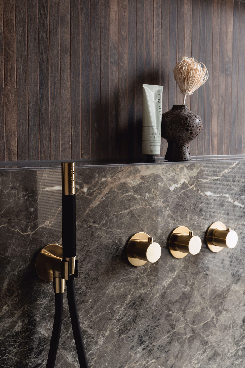 Voor de finishing touch is gekozen voor geborsteld messing kranen, die de badkamer een nog luxere uitstraling geven en het wellness gevoel compleet maken.