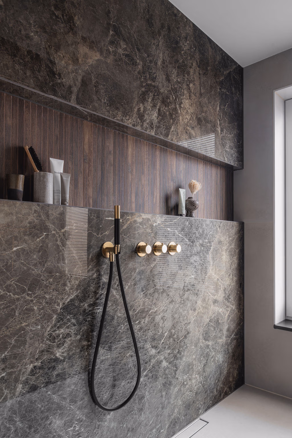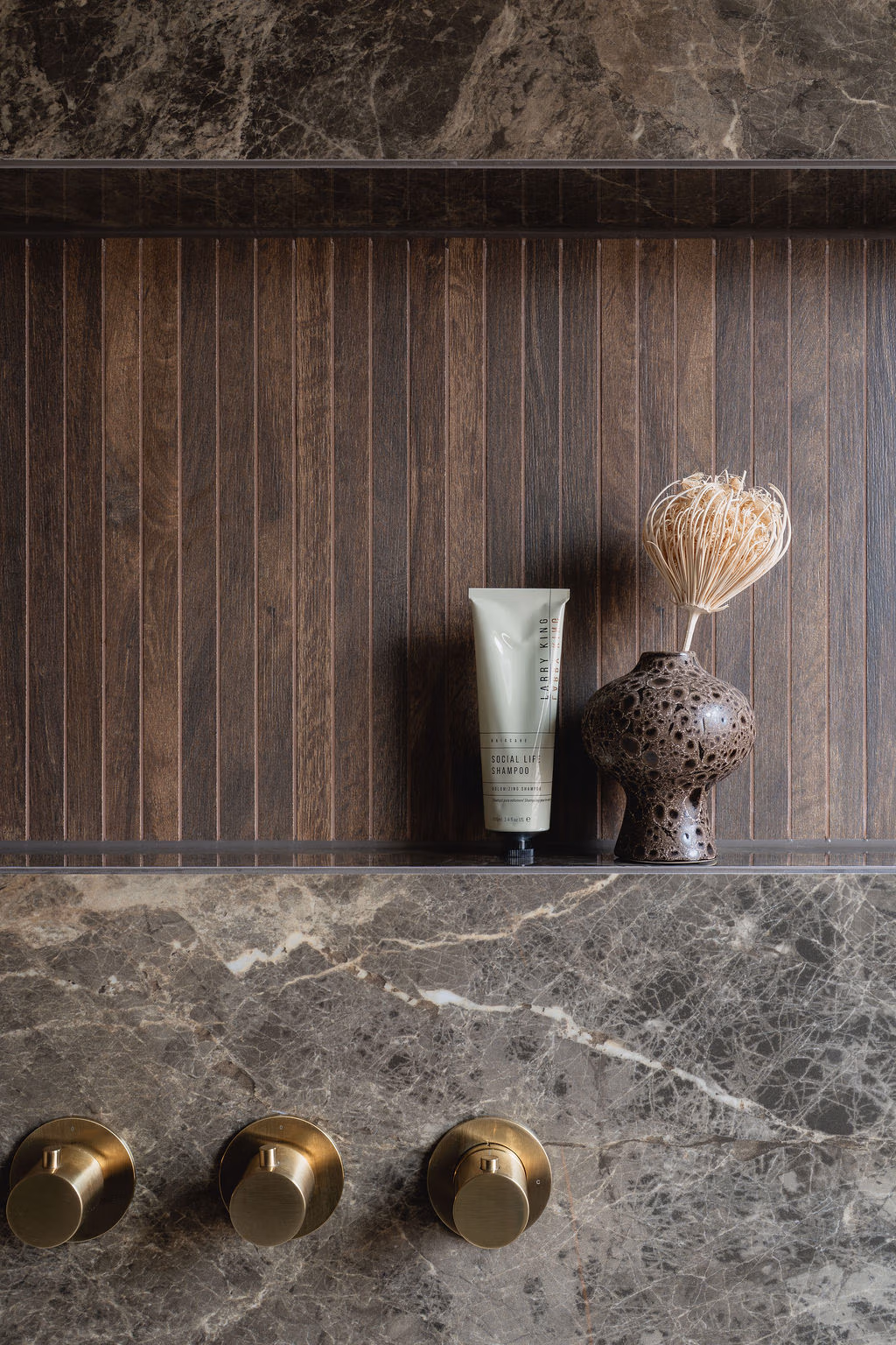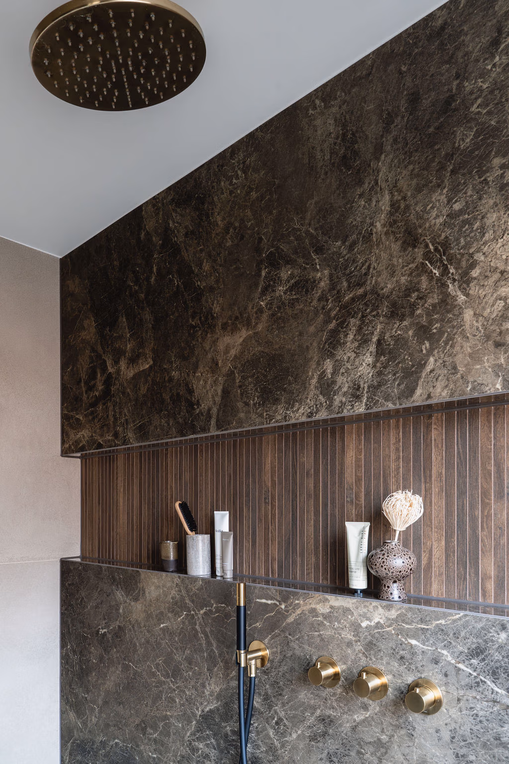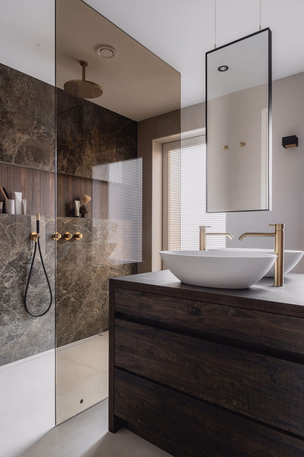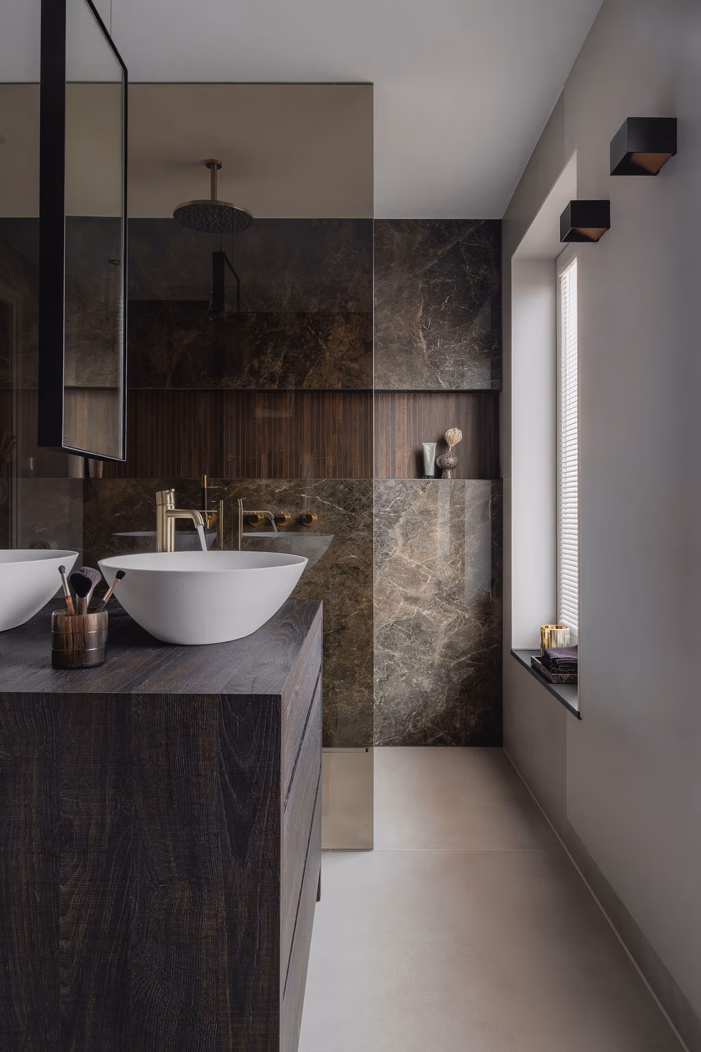 Het gebruik van gekleurd glas zorgt voor warmte in de ruimte. De donkere houttint op de achterwand en in de nis van de douche zorgen voor nog meer sfeer in de badkamer. Hiermee wordt ook de kracht van de marmerlook tegel versterkt. Al met al een luxe uitstraling.